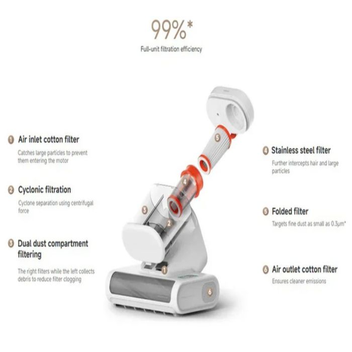 تنظيف عميق مخصص للمراتب والكنب والوسائد وكل الأسطح القماشية التي تحتفظ بالتراكمات داخل النسيج. مكنسة شاومي 2 برو تجمع شفطاً إعصارياً قوياً مع طرق عالي التردد لالتقاط الغبار الدقيق وقشور الجلد وبقايا العث التي قد لا يصل إليها التنظيف العادي. كما تضيف تعقيماً بضوء UV LED مع موجات فوق صوتية لإزعاج دورة العث، ثم هواءً ساخناً يساعد على تقليل الرطوبة لتصبح الأقمشة أكثر جفافاً وراحة.