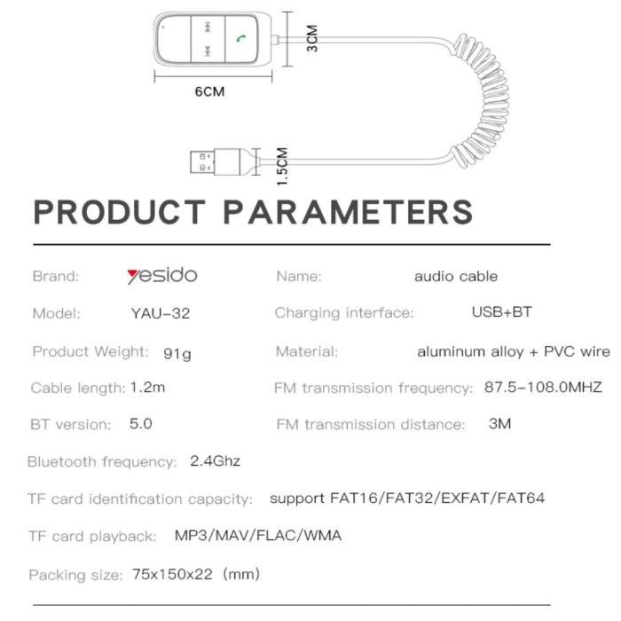 استمتع بنقل الصوت عالي الجودة من الهواتف والأجهزة اللوحية إلى أجهزة الصوت مع كيبل Yesido YAU32 .يتميز بتصميم عالي الجودة مصنوع من سبائك الألومنيوم وسلك PVC لتحمل الحرارة وضمان متانة طويلة. يدعم البلوتوث 5.0 ونقل الصوت إلى أجهزة FM بتردد 87.5-108.0 ميجاهرتز لمسافة حتى 3 أمتار. يحتوي على مفتاح تشغيل واضح وسهل الاستخدام، ويتيح عرض الموسيقى أثناء النقل
