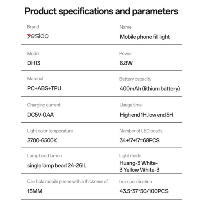 حلقة إضاءة سيلفي لاسلكية بمشبك DH13 من Yesido