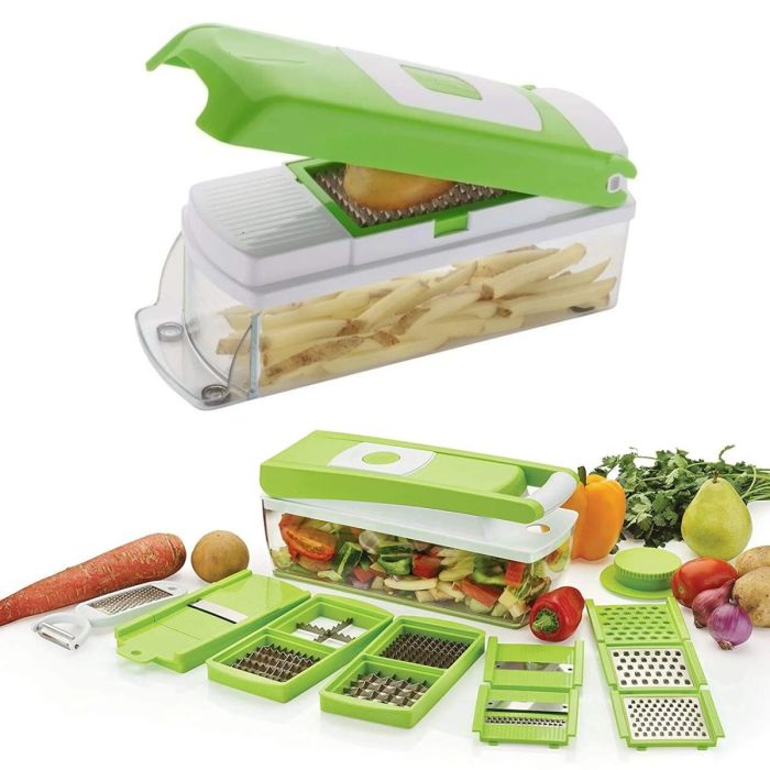 - Works as grater, cutter, peeler, slicer, chopper, dicer and zester. This Precision Food Chopper comes with interchangeable blades, allow you to cut perfectly uniform vegetables, fruits & more in 11 different ways. Cut into different size cubes or pens, strips, quarters, picks, clean slices or julienne. Shortens the cooking