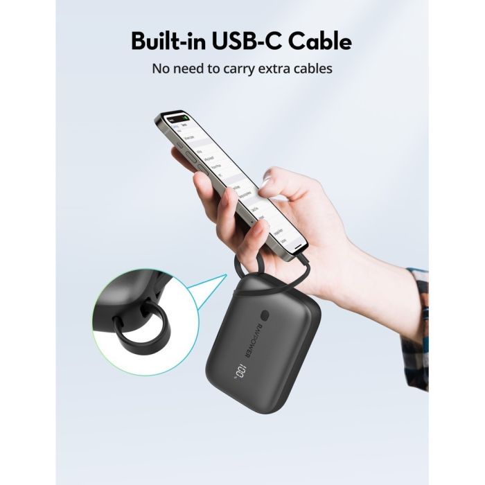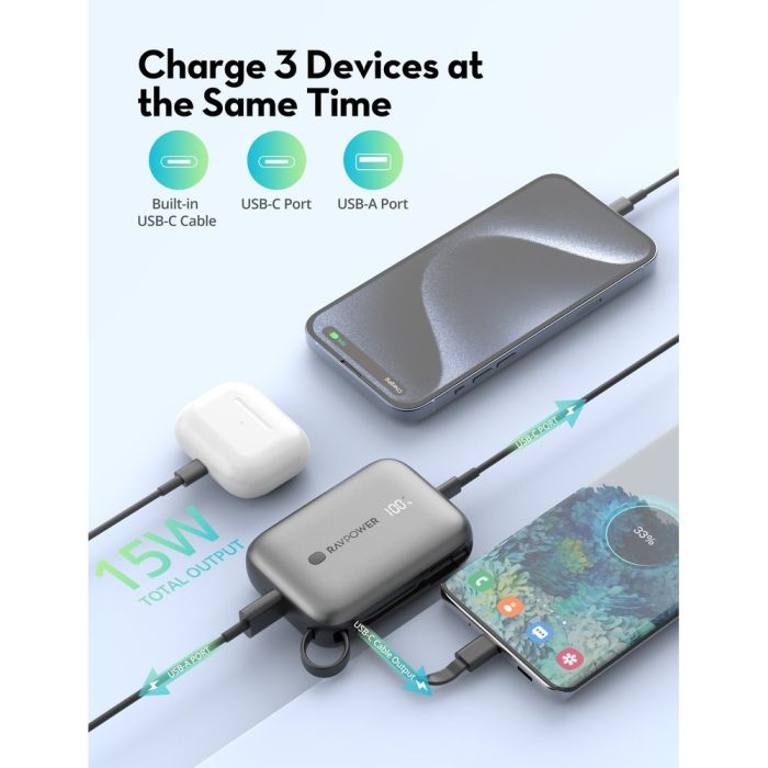 - Power Bank 10000mAh 20W with Built-in Cable + USB-C and USB-A Ports by RavPower