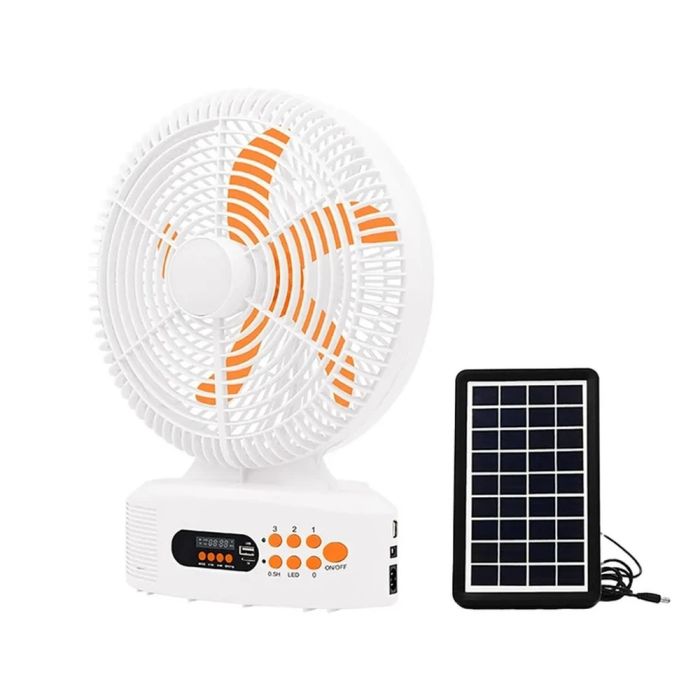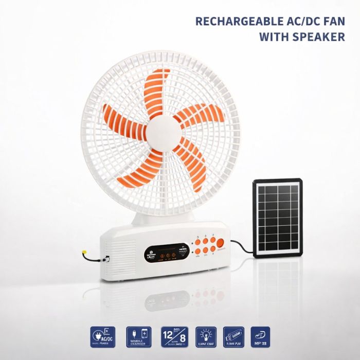 Multi-functional fan powered by solar and electricity, equipped with a Bluetooth speaker supporting TF, USB, and FM radio, and an 18 LED night light. The 6V battery provides up to 8 hours of operation, making it suitable for home, camping, and power outages