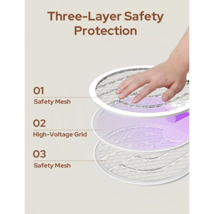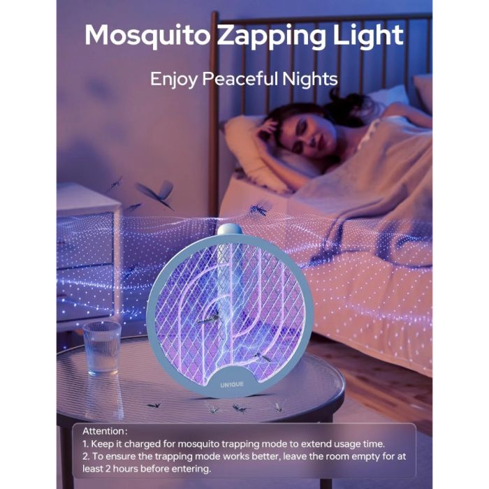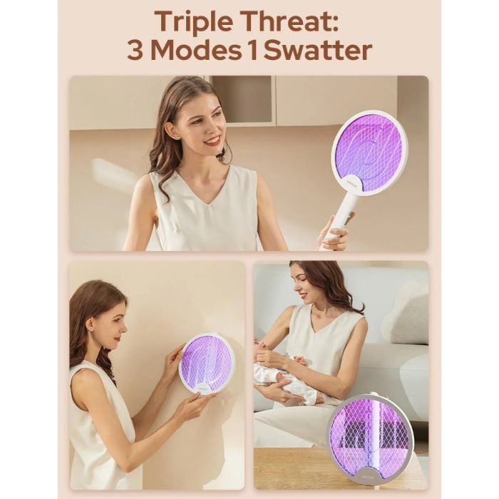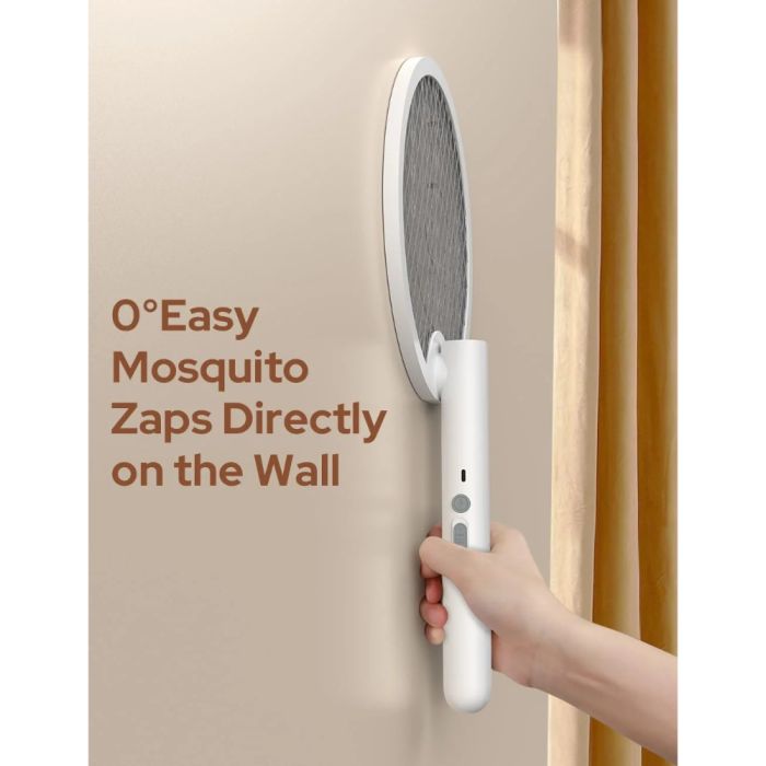 - 3-in-1 foldable mosquito bat with swivel design for easy hanging, placing on tables, or handheld use