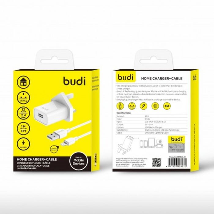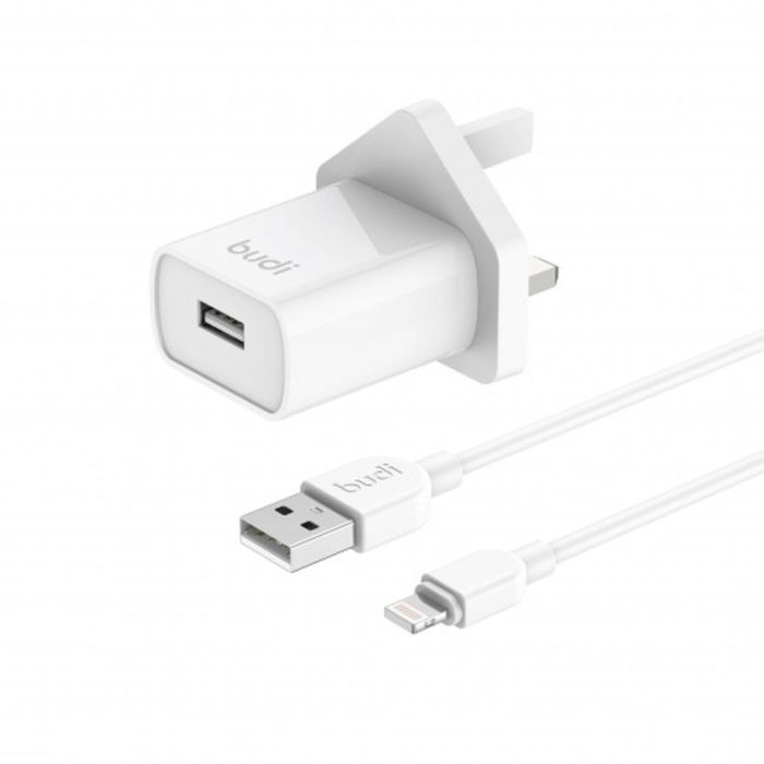 Charge your iPhone quickly and efficiently with the Budi 12W Home Charger. This convenient combo includes a 1-meter Lightning cable and a UK plug, providing everything you need to power up your device at home.