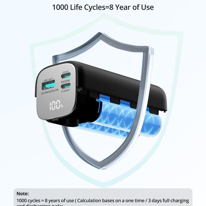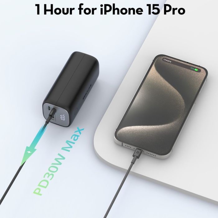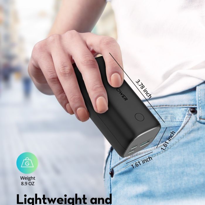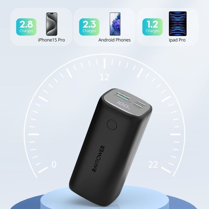 The RAVPower backup battery ensures your devices stay charged all day thanks to its large capacity and compact design. It offers three charging ports that allow you to share power with friends or charge multiple devices simultaneously, with support for PD technology that significantly speeds up the charging process.