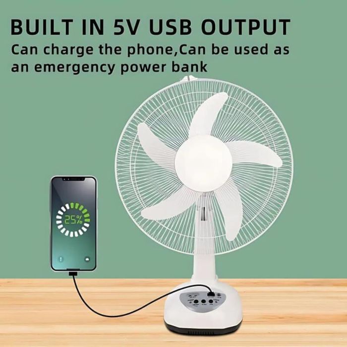 - Built-in 5V USB port transforms fan into a power bank for charging your phone