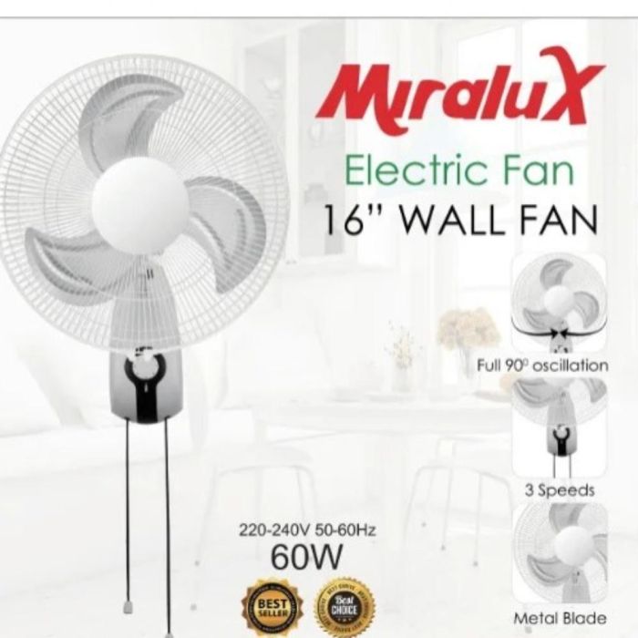 16 Inch Wall Fan with Metal Blades and 3-Speed Control 60W by Miralux