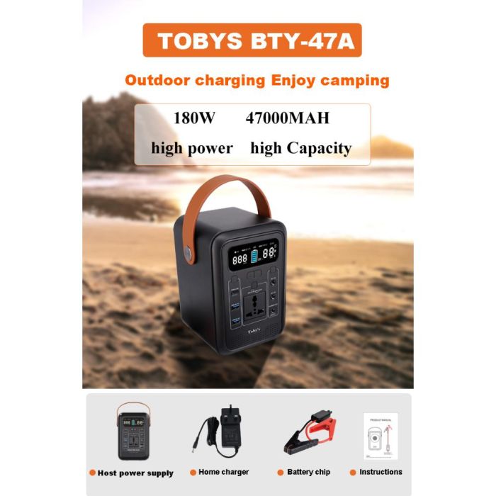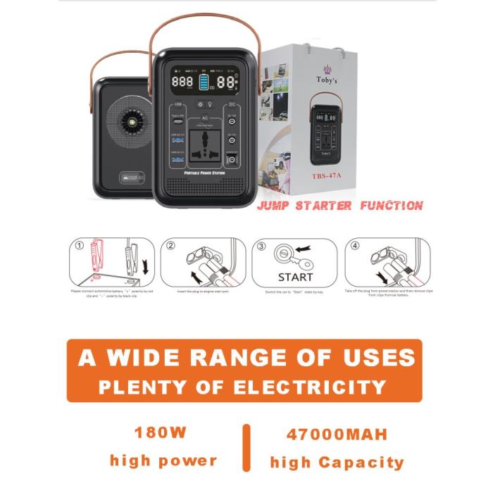 Stay connected wherever you go with this portable battery. With 178 watts of power and a massive 47,000 mAh capacity, you can power your devices, quickly charge your phones, and even jump-start your car when needed. Ideal for camping, long trips, and emergencies, this station delivers powerful and reliable performance. It also supports four different charging methods (USB, Type-C, car, and AC outlet) to suit all your needs. With its smart design and multiple protections against overheating and high voltage, you can count on it everywhere. The built-in emergency lighting adds extra convenience during nighttime use or power outages.