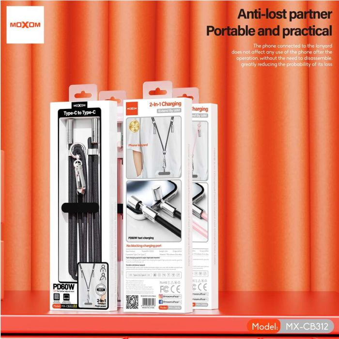 The Moxom cable is a game-changing that doubles as a fast charging cable and phone lanyard for maximum portability. With support for PD60W fast charging and high-speed data transfer, it's ideal for smartphones, tablets, and even laptops. The durable 6mm build ensures long-lasting performance, while the anti-lost 1.6 meter lanyard design makes it a practical everyday accessory. Whether you’re traveling, commuting, or working, this cable ensures quick access, stable power, and a hands-free solution all in one