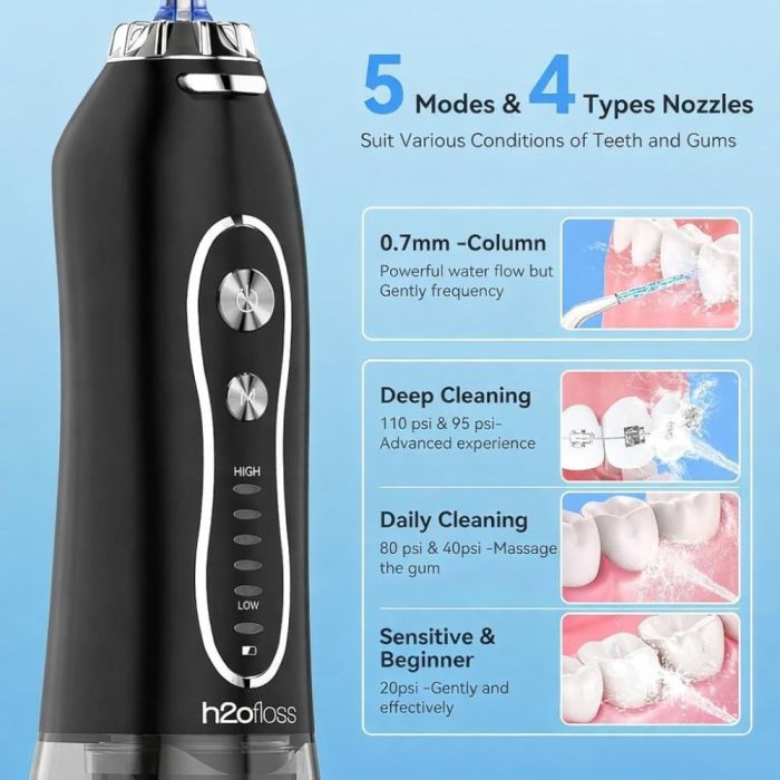 This Water Flosser can remove plaque between teeth and gums from inaccessible places more effectively than traditional dental floss, ideal for people with braces, featuring a specially designed nozzle for cleaning teeth with braces, and is three times more powerful and effective at removing plaque with 5 cleaning modes and 4 jet nozzles