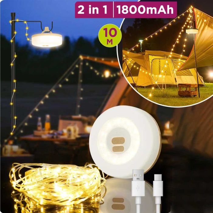 A practical lamp combining string and portable lighting, perfect for outdoor activities like camping and parties. Offers 7 customizable lighting modes with a rechargeable 1800mAh battery and Type-C charging cable. Lightweight and compact design makes it easy to store and carry. Waterproof with an IPX4 rating, ensuring performance in any weather. Built with durable materials like ABS and copper wire for long-lasting use.