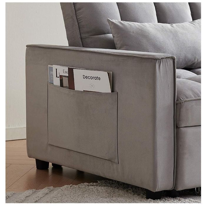 This 2-in-1 sofa bed features a solid wood and metal frame, high density foam padding, smooth conversion from sofa to bed, durable soft fabric, side storage pockets, and hidden wheels for easy movement and practical daily use