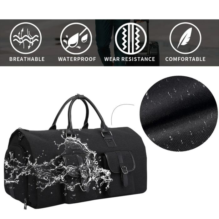 - The garment duffle bag is made of high quality material, which is waterproof, scratch-resistant and tear-proof. The zippers and reinforced stitching further enhance the durability and longevity of this bag