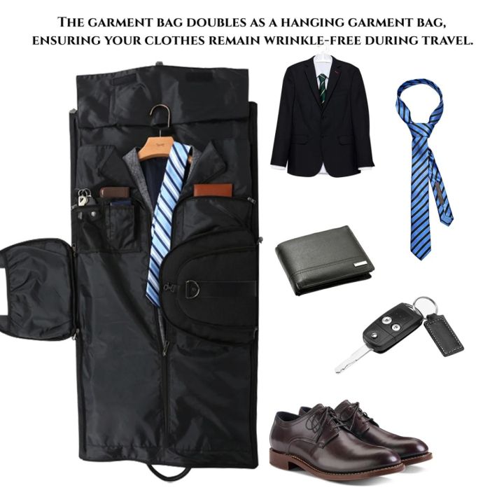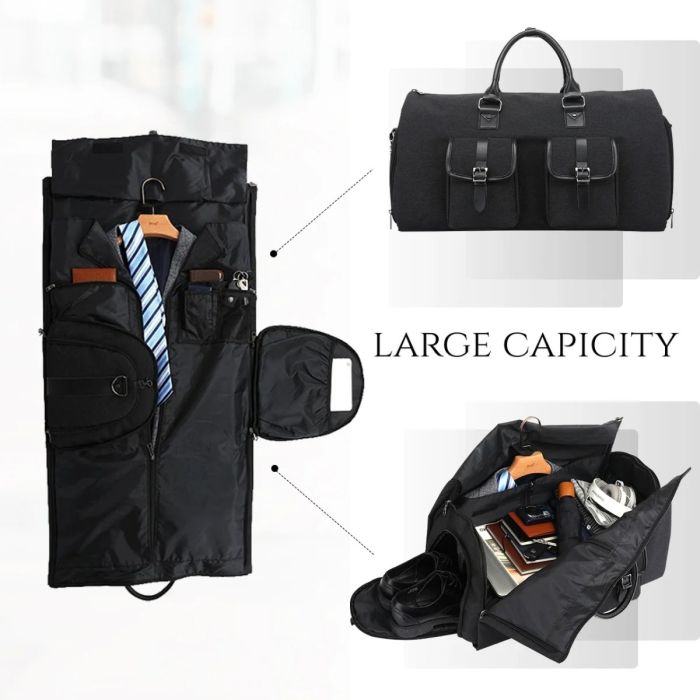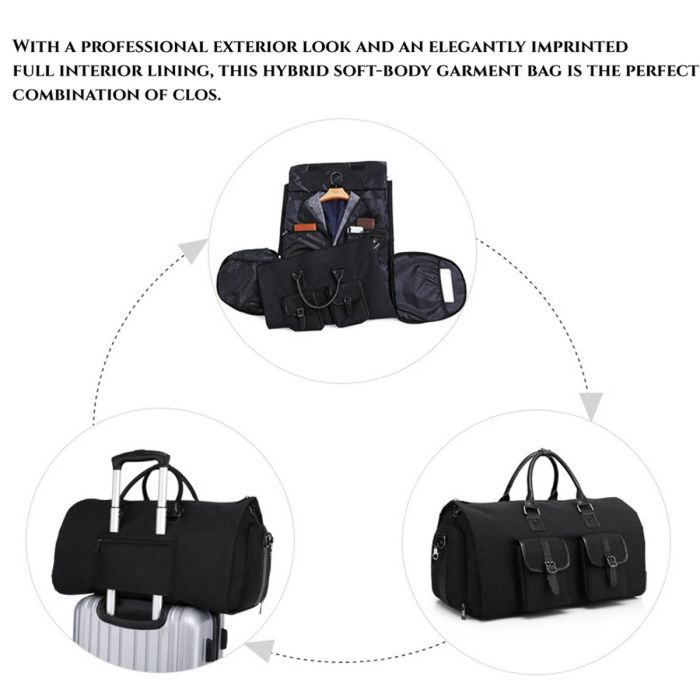 - The travel suit bag combines features of a duffle bag and a hanging bag. While lay it out, it can be a great hanging garment bags for travel