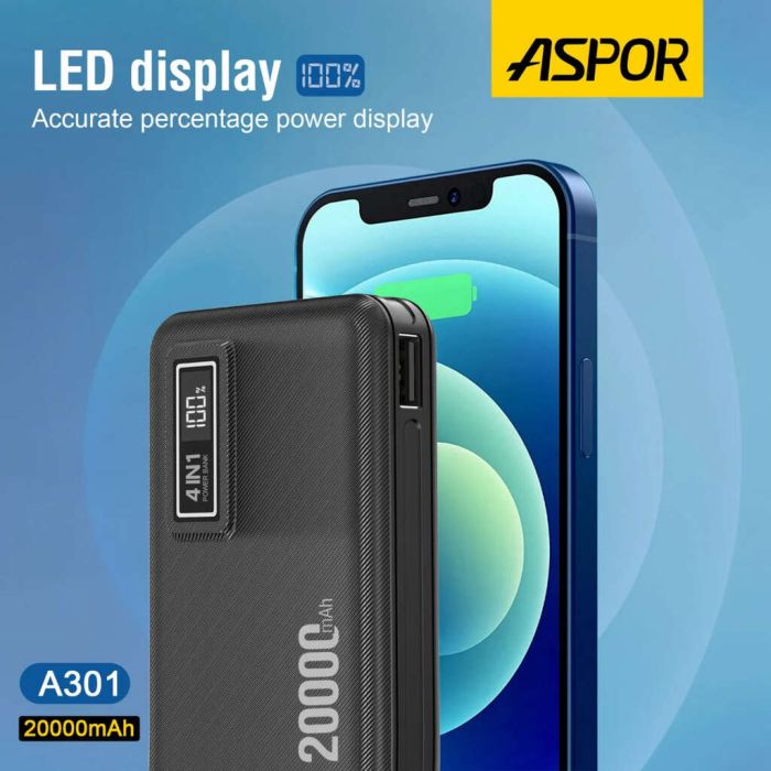 Never worry about your devices running out of battery again. The Aspor A301 Power Bank is the perfect solution for keeping your devices charged wherever you are. With its large 20,000mAh capacity, you can charge your phone or tablet multiple times. Its handy design includes four built-in cables, eliminating the need to carry extra wires. The LCD display also allows you to accurately monitor the remaining battery level, keeping you informed of the charging status.