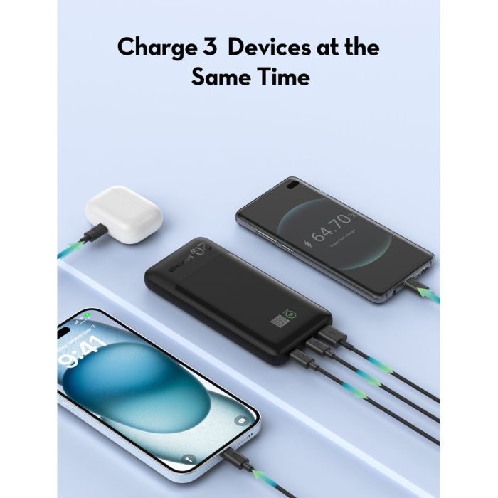 If you're looking for massive capacity, the RavPower 20000mAh 20W battery is your perfect companion for long journeys. It supports PPS and PowerIQ 3.0 technologies across its three ports, providing optimal and safe charging for phones and tablets. Its large, aircraft-grade capacity gives you enough power for days without the need for frequent recharging.