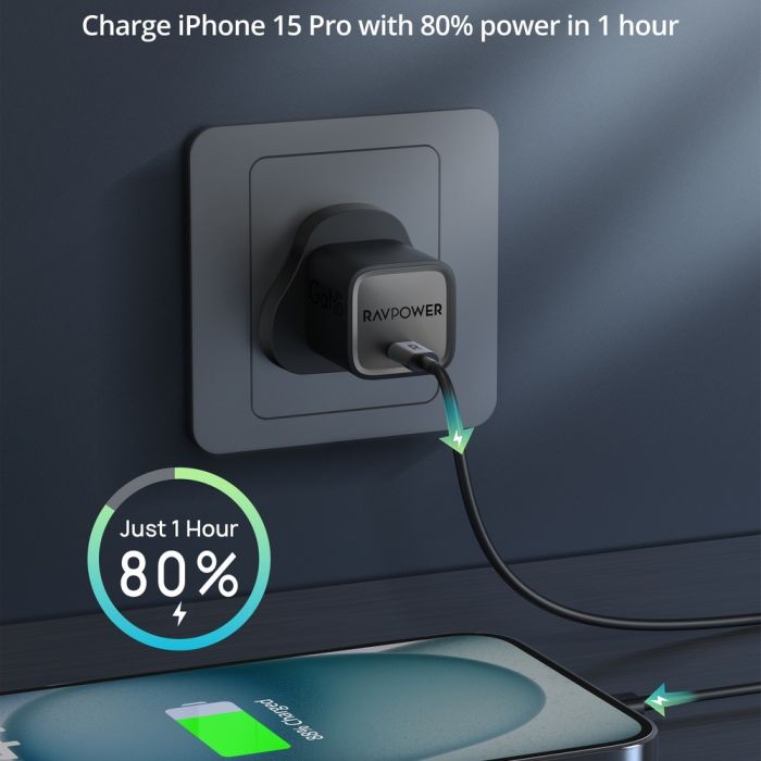 The RAVPower wall charger utilizes advanced GaN technology, delivering high charging power in a much smaller size than traditional chargers. It features two ports for simultaneous powering of two devices with optimal efficiency, solving the problem of slow charging and cleverly saving space in your wall outlet.