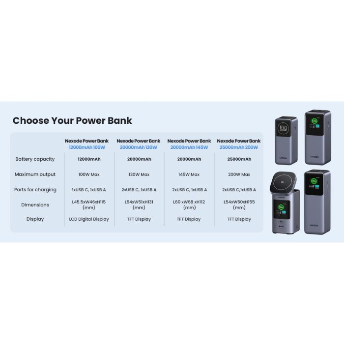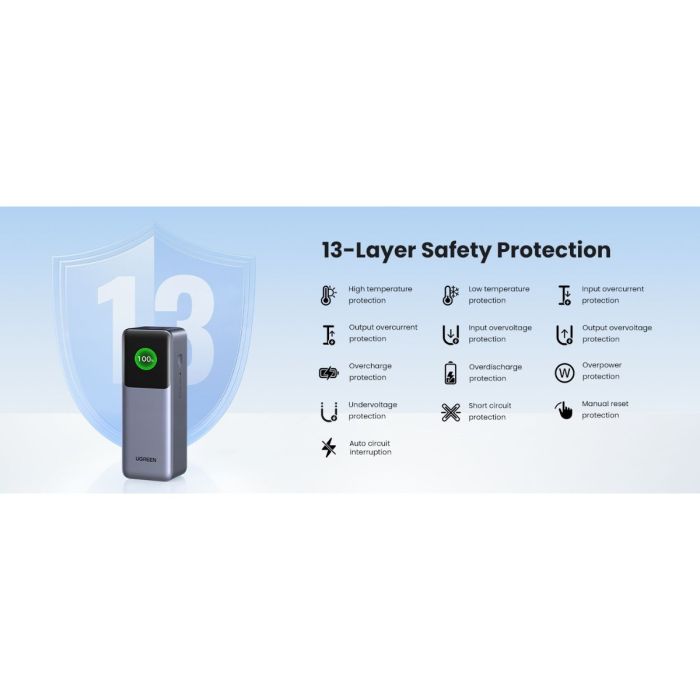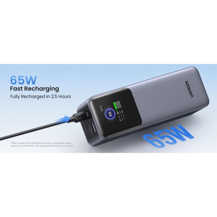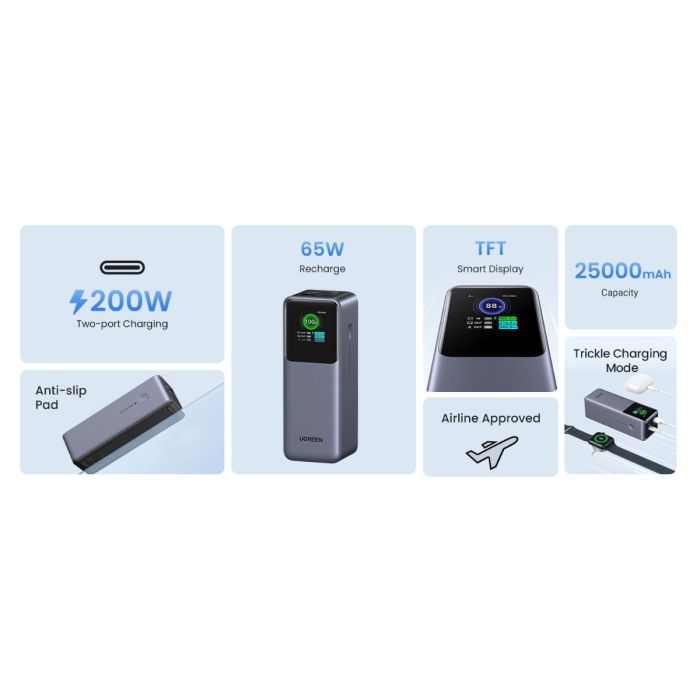 Ultimate power with the UGREEN 25,000mAh backup battery featuring 200W ultra-fast charging with PD 3.1. Charge a MacBook Pro to 56% in just 30 minutes or an iPhone 15 five times. Equipped with a premium TFT display for real-time battery status, it boasts a compact design for easy portability. Supports multiple device charging with dual 100W USB-C ports and a USB-A port, and includes a USB-C to USB-C cable for faster, more efficient charging