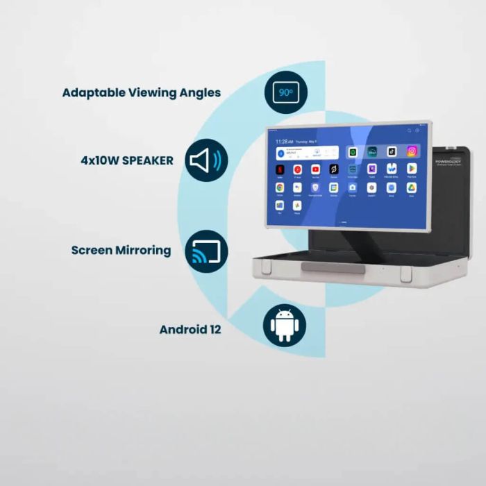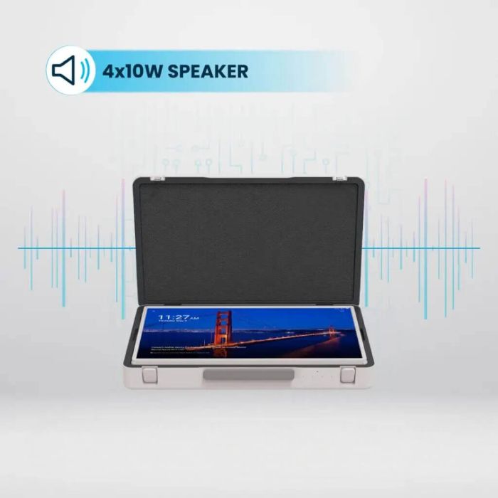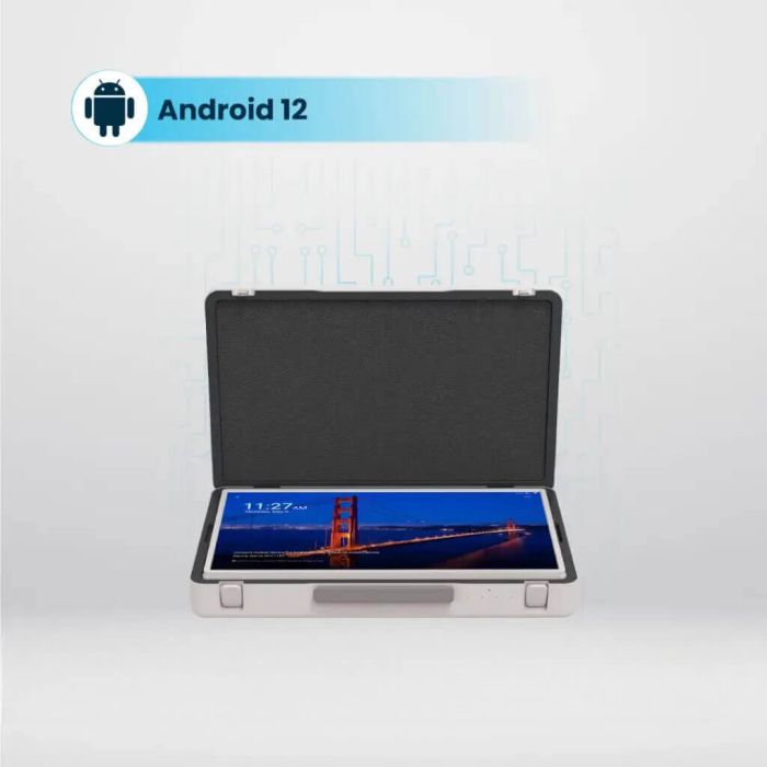 Unlock a new level of productivity and entertainment with the innovative briefcase Android screen. It combines a vibrant Full HD touchscreen with the versatility of Android 12. Featuring a powerful processor, ample 8GB RAM and 128GB storage, integrated Wi-Fi and Bluetooth, and a long-lasting battery. The briefcase design adds convenience use and store, while the multiple ports ensure seamless connectivity