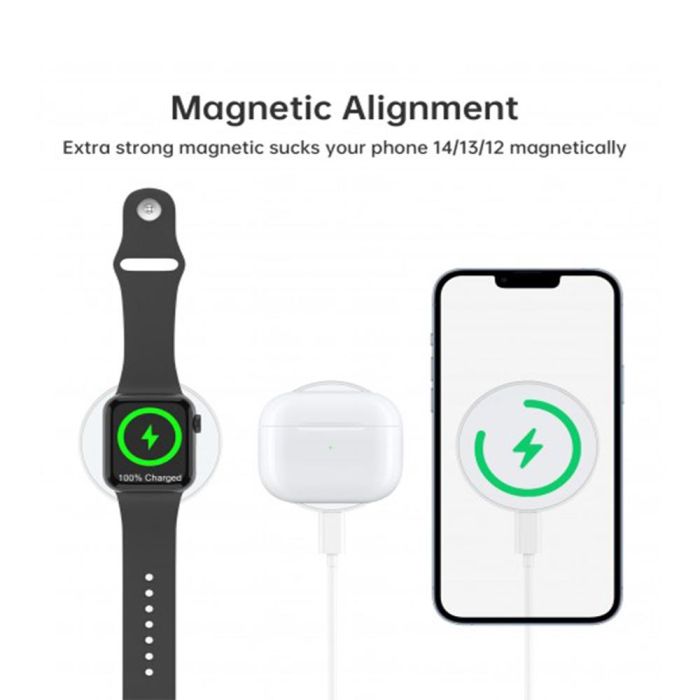 This 3-in-1 magnetic wireless charger comes in a sleek and compact design. It supports fast charging up to 15W for phones and 3W for headphones and smart accessories, making it ideal for everyday use at home or in the office.
