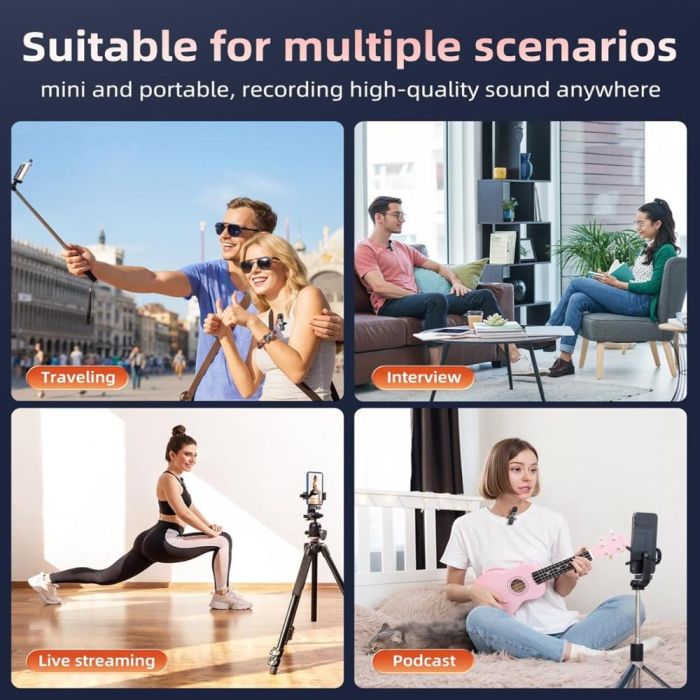 A small wireless microphone that provides high-quality audio recording for your iPhone, iPad, Android device, camera, or computer, with support for recording two audio sources simultaneously. It features a smart noise-canceling chip, delivering clear and stable sound without distortion. It supports automatic plug-and-play connectivity without the need for an app, allowing for direct audio monitoring through the earbuds. It boasts a rechargeable battery that lasts up to 6 hours after approximately 60 minutes of charging, and a coverage range of up to 20 meters.