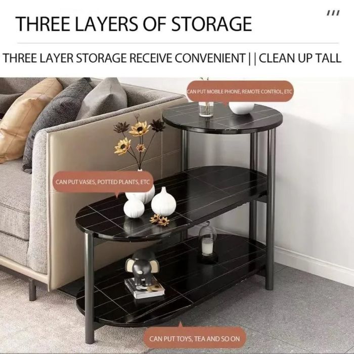 Elevate the functionality and style of your living room with this sleek and modern 3-layer side table. Designed to complement any sofa or seating area, it offers a perfect blend of convenience and contemporary appeal. The table features three spacious tiers, providing ample open storage for books, magazines, remote controls, or decorative accents. The minimalist design ensures it fits seamlessly into various interior styles, from casual to sophisticated