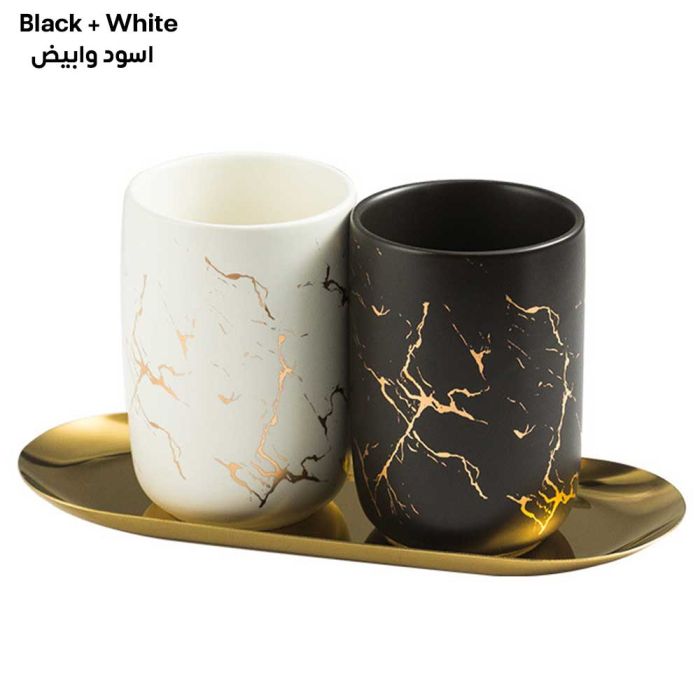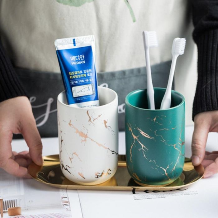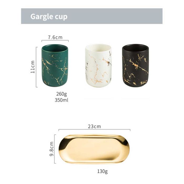 This premium set includes two elegant ceramic cups with a marble pattern and a golden metal tray that adds a refined touch to your bathroom. Featuring a modern Nordic design, each 350ml cup is perfect for mouthwash or organizing toothbrushes and toothpaste. Made from high-quality materials with coordinated colors, it’s an ideal choice for upscale homes and hotel use.