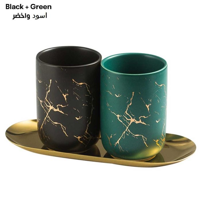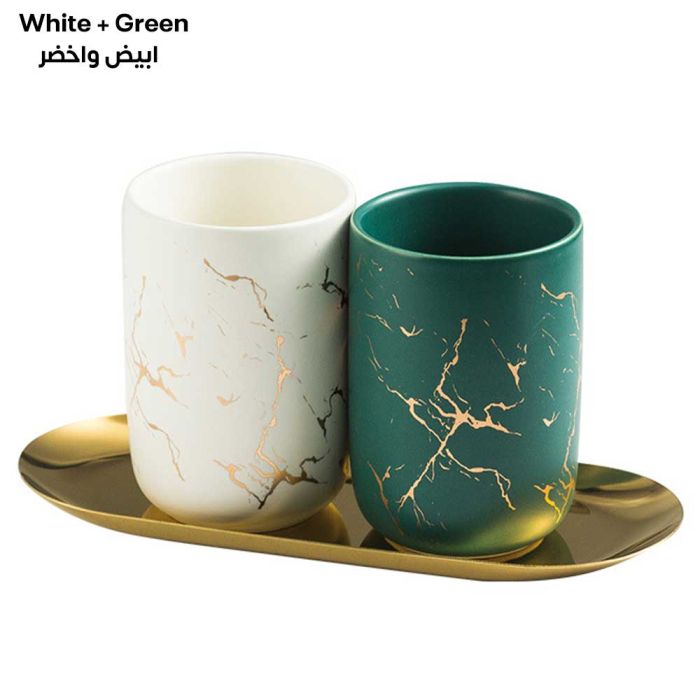 - 350ml Ceramic Mouthwash and Toothbrushing Cup Set 2Pcs with Tray