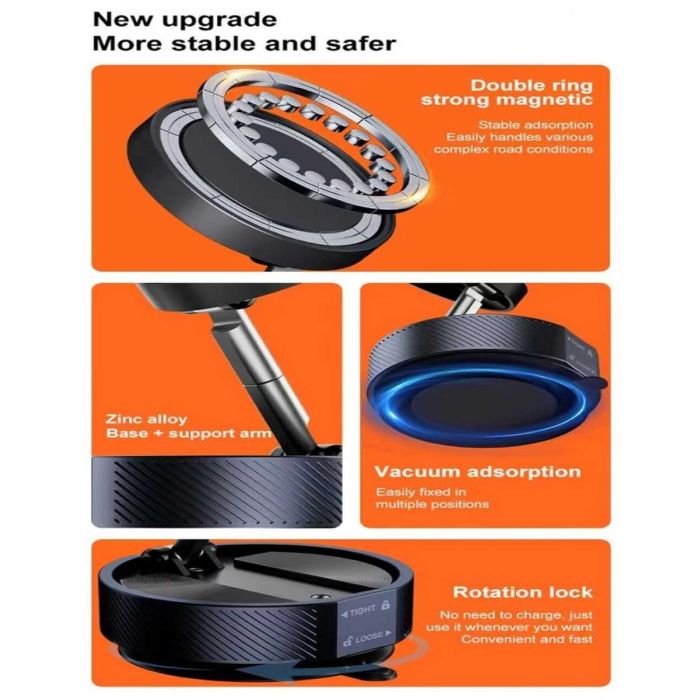 - Vacuum Suction Base: The mount features a high-performance vacuum suction system that sticks firmly to your dashboard or windshield. The suction base is reusable, allowing you to reposition the mount without leaving any sticky residue or causing damage to your car’s surface