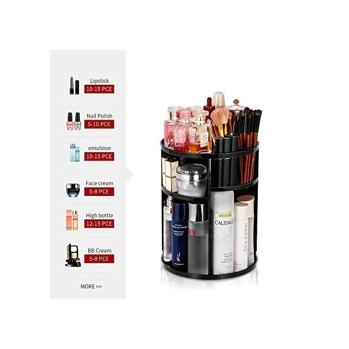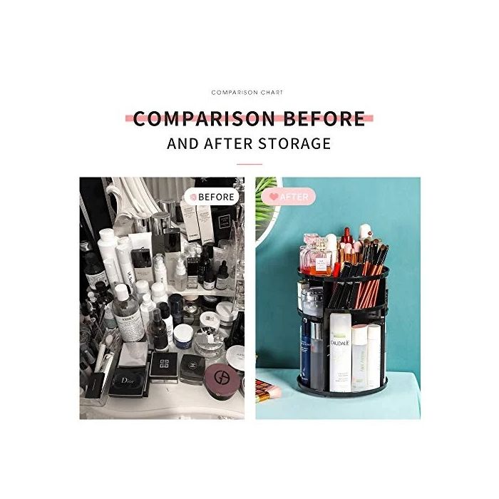 360 Rotatable Adjustable Cosmetic Organizer will help you to keep your makeup neat and tidy without the hassle of putting it away and taking it back out a many times a day