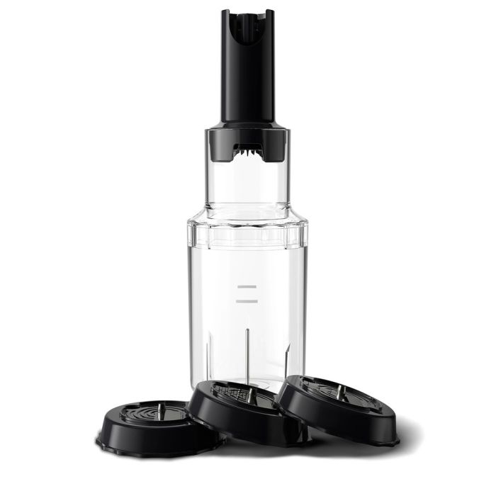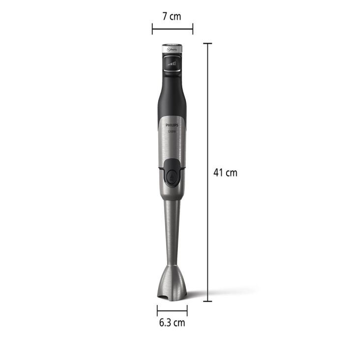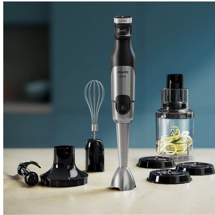 This Philips hand blender makes cooking easier and faster, thanks to a powerful 1200W motor. It comes with multiple attachments, including a chopper, whisk, and spiralizer, to cover a variety of kitchen needs, from smoothies and sauces to innovative vegetable preparation. Advanced technologies like ProMix and SpeedTouch deliver precise, smooth results, with a compact design that's easy to store and use every day.