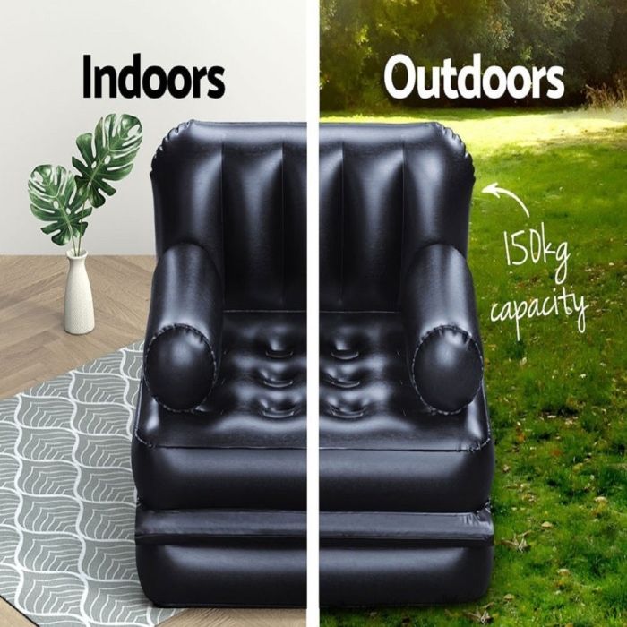 Portable chair and mattress with two-way quick inflation and deflation valve. Made from a sturdy PVC construction, with weight capacity up to 150kg to provides comfortable support for sitting and sleeping