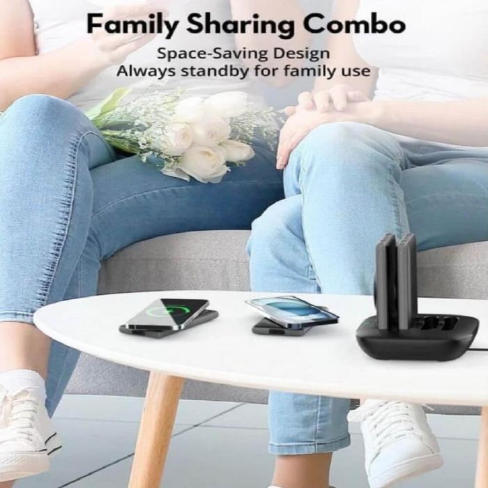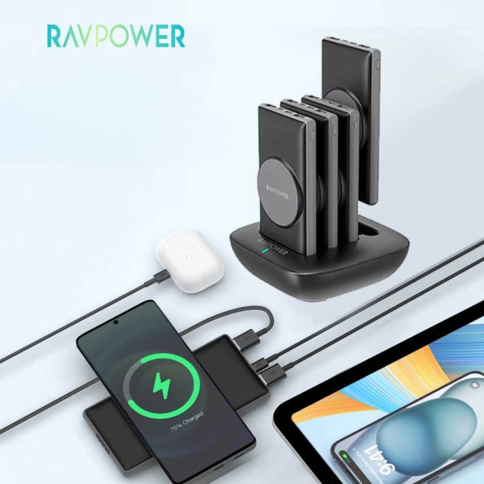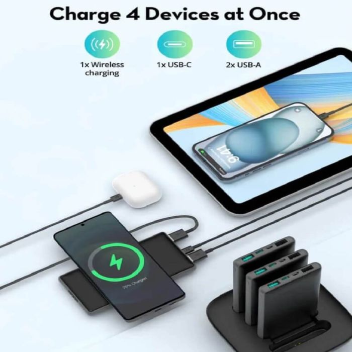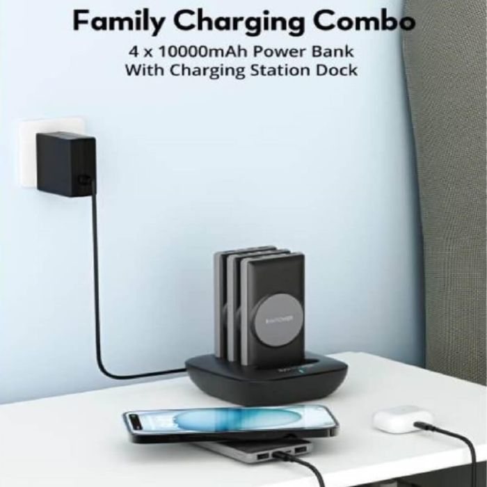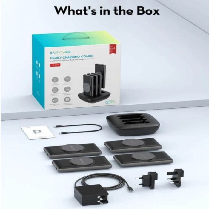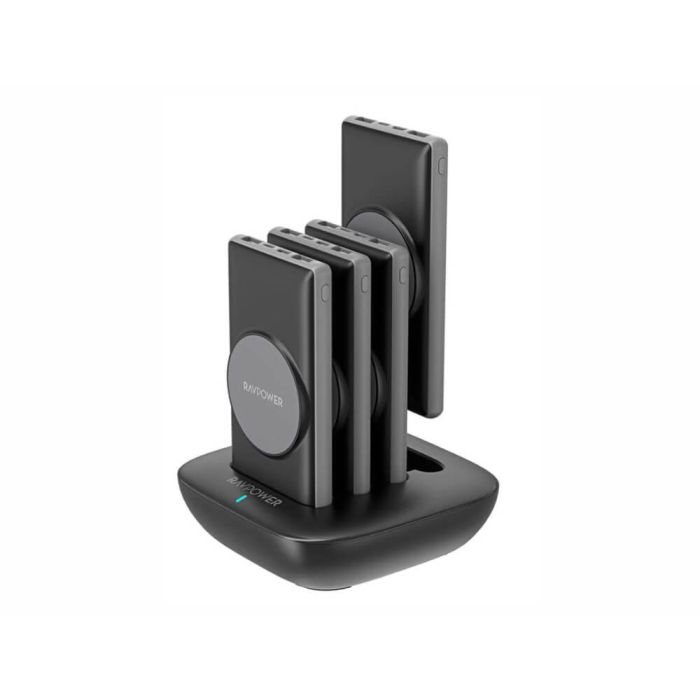Stay Powered, Stay Ahead. RAVPower offers the perfect solution for charging efficiently and quickly. This 4 in 1 power station delivers blazing-fast charging for all your devices, combining robust capacity with cutting-edge technology in a sleek design. With four 10,000mAh batteries, the station supports PD 20W fast charging via USB-C and QC 18W via USB-A Ports, as well as 15W magnetic wireless charging. Designed to meet all your needs by charging up to 4 devices simultaneously. Equipped with automatic charging dock base, the batteries will always be ready for use. Never wait for a backup battery to be charged, you will always have one ready. Making it Perfect for Dewaniya, Camping, Home, Office, Restaurant and Cafes