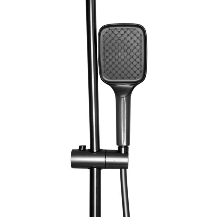 - It features a wide overhead shower head, a handheld sprayer with base, and a hidden water outlet below.