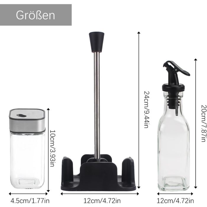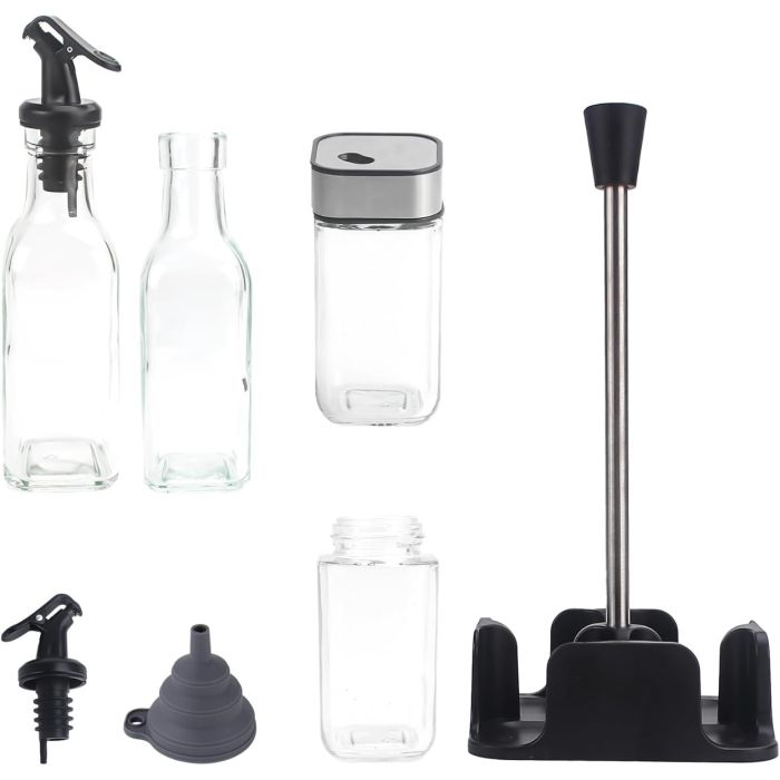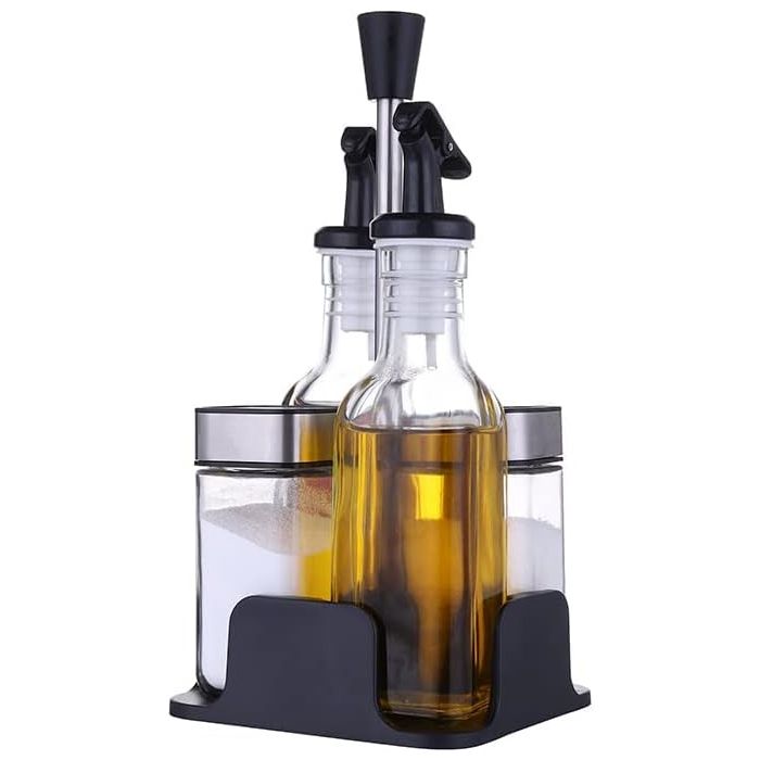 - 2 x 200 ml vinegar bottles glass and olive oil bottle drizzler, 2 x 100 ml salt and pepper pots and 1 durable coaster,The ideal set for various occasions: can be used to prepare meals or directly used in breakfast, lunch and dinner, family celebrations, outdoor barbecues and other occasions
