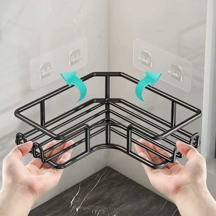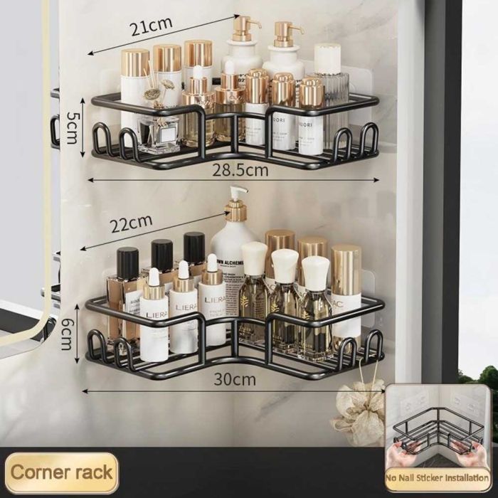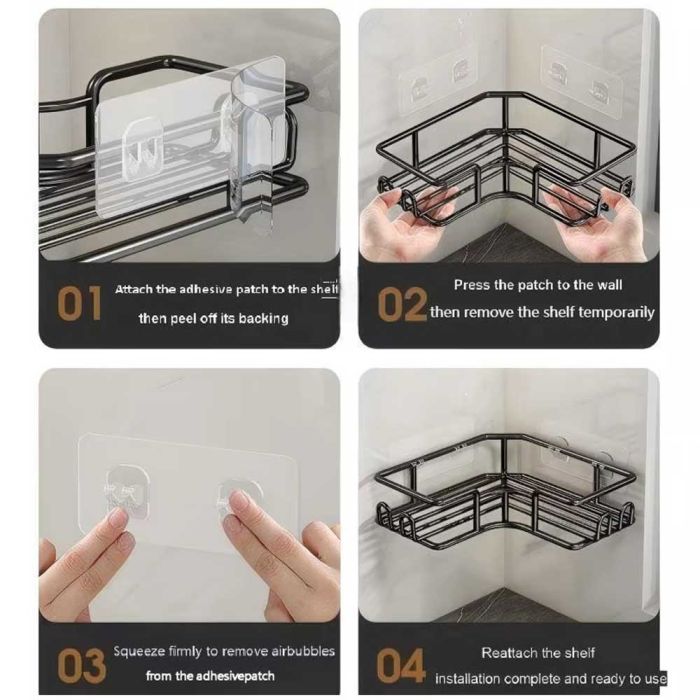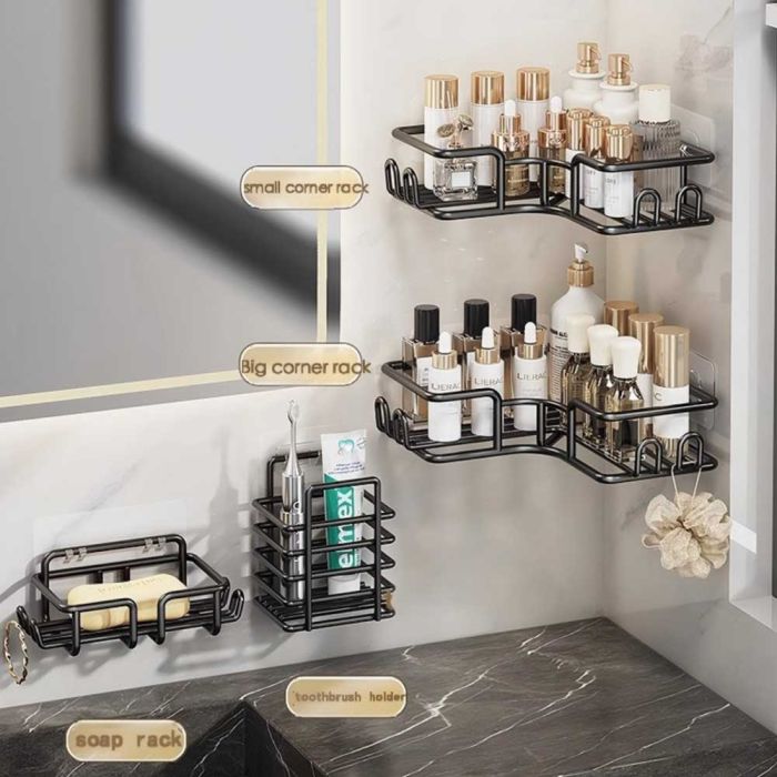 This 4-piece corner rack set for bathroom is made of metal, giving your daily essentials an elegant organized look, with adhesive wall-mounted installation without drilling and smart space-saving design for a neater bathroom that stays beautifully arranged