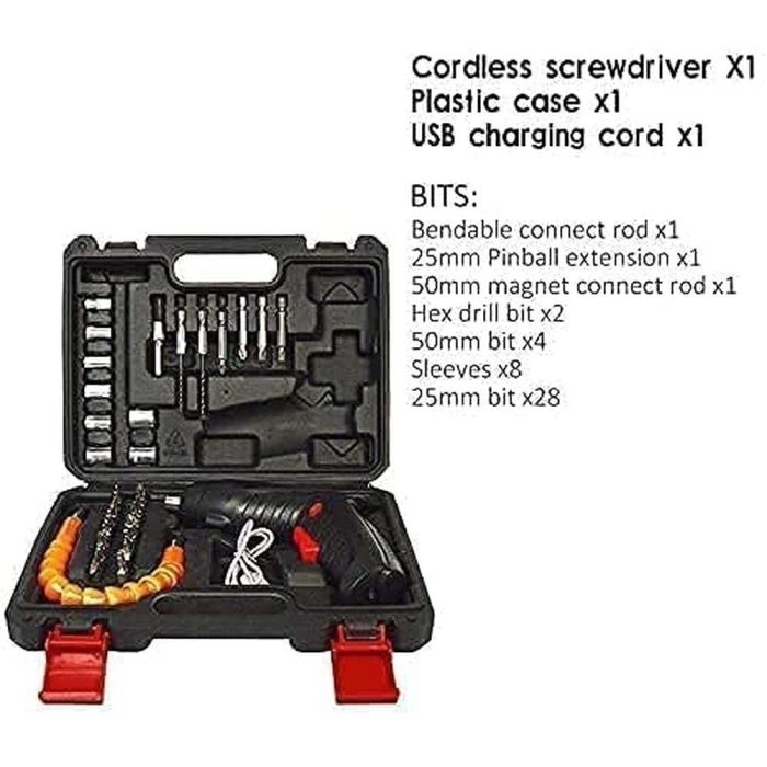 Upgrade your toolkit with a high-powered, rechargeable cordless screwdriver! This all-in-one kit includes 47 essential attachments, making it ideal for a wide range of tasks. Thanks to its powerful motor, rechargeable battery, and ergonomic design, you'll enjoy enhanced control and efficiency. Perfect for professionals and hobbyists alike, this compact and easy-to-use kit ensures you get the job done quickly and effortlessly. Get ready for any project with ease!