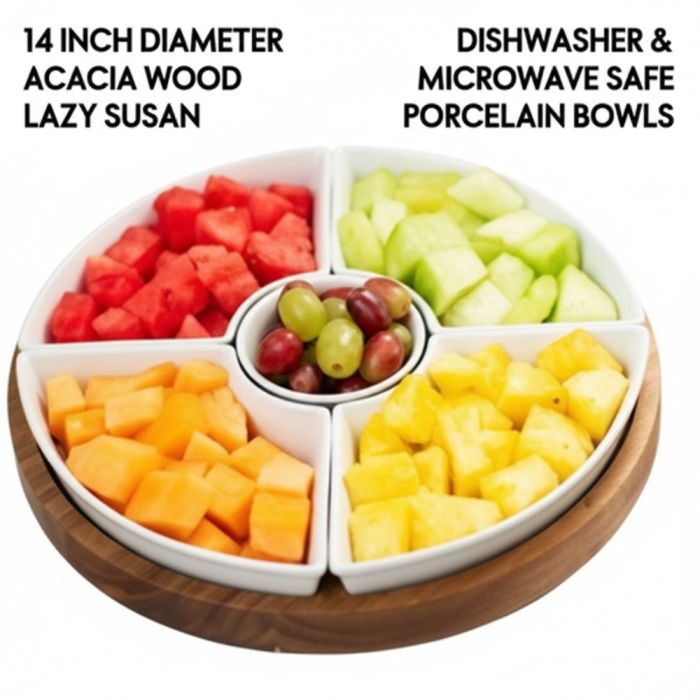 Serve food in style with this wooden and porcelain serving set that combines practicality and beauty. The detachable bowls and wooden dividers make food organization easy and convenient, with a design perfect for everyday use or special occasions.