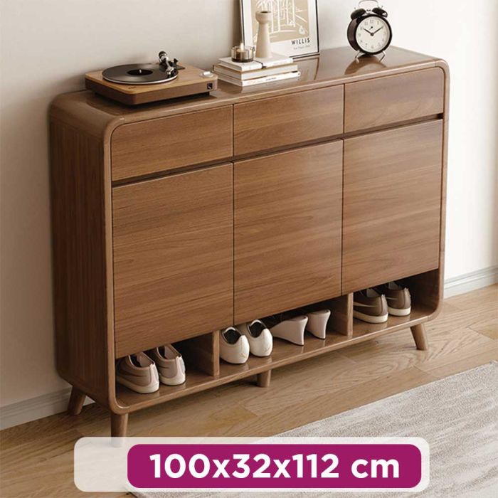 This Large-capacity Solid Wood Shoe Organizer Made of Full Turmeric Sandalwood, with a Traditional Design and Enormous Storage Capacity, Maintaining Its Quality and Adding a Touch of Luxury to the Entryway, an Ideal Entryway Solution for Stylish Storage.
