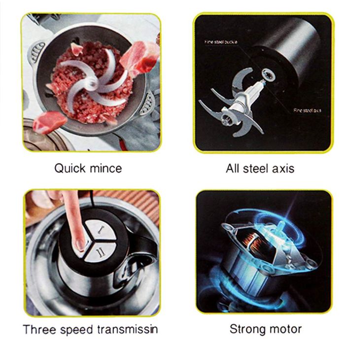 A powerful electric food chopper made of durable stainless steel for long-lasting durability. It's the essential tool in your kitchen to finish tough chopping and mincing tasks with super speed. It features a 5-liter bowl with professional stainless steel hexagonal blades, making it ideal for chopping meat and vegetables and preparing marinades with ease. It has a pure copper motor with a powerful 1000 watts of quiet operation, with a built-in handle design for easy carrying and control over three high speeds to ensure you get the perfect texture for all your ingredients in record time.