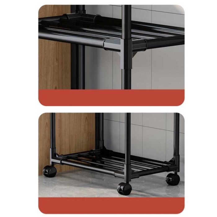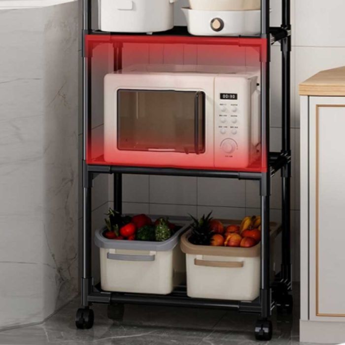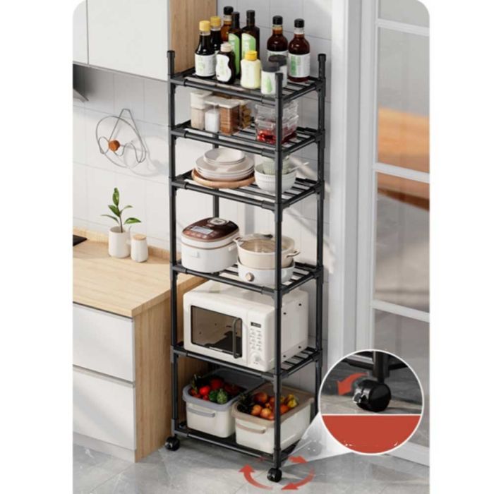 This Rack 6 Layers is made of durable metal, featuring a vertical design for clear organization and easy access, wide shelves for large appliances and daily items, with 360 swivel wheels for smooth movement and an option to lock in place, ideal for kitchens and also suitable for storage areas, laundry rooms, or offices