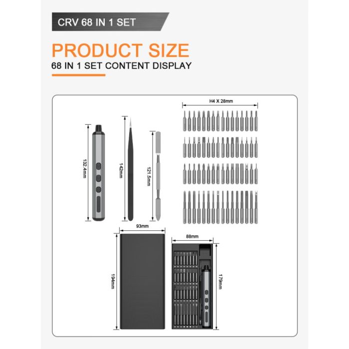 This 68-in-1 Multi-Use Precision Electric Screwdriver Set is made of CR-V steel, includes 64 different screwdriver bits, features LED light with control button, supports forward and reverse rotation with auto stop, compact design with magnetic storage case