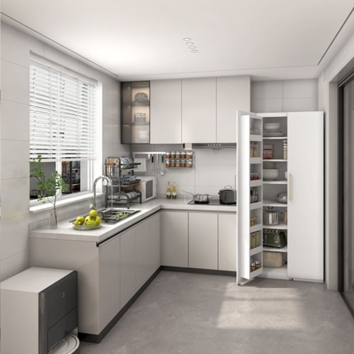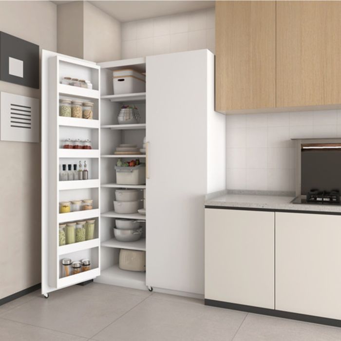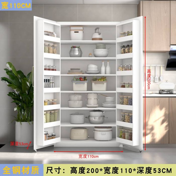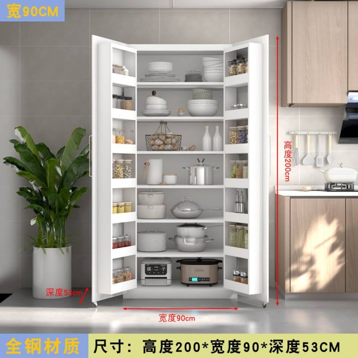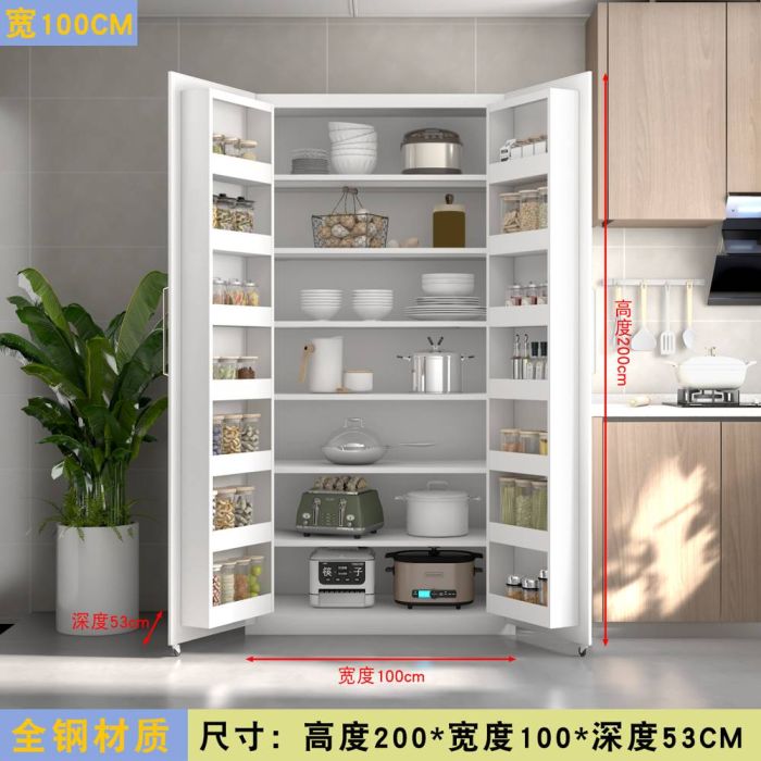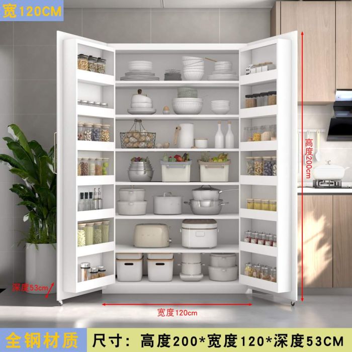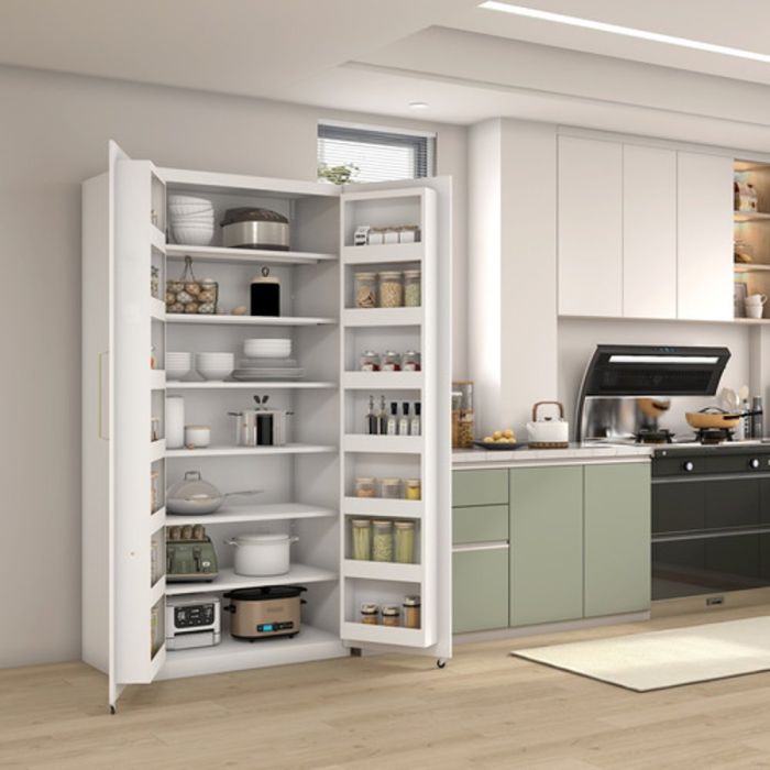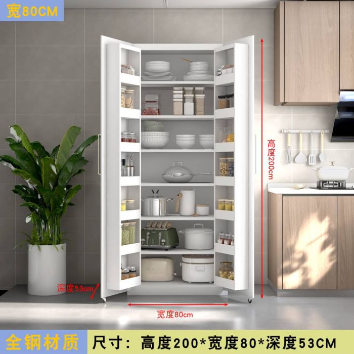 This 7 tier wooden kitchen cabinet features a practical design with front doors and integrated side shelves, offering large storage capacity for organizing cookware and kitchen appliances, ideal for maximizing space and maintaining a clean, modern kitchen look