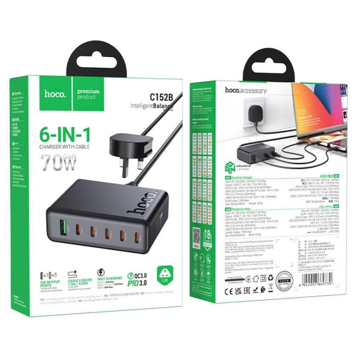 Get fast and flexible charging for your devices with the Hoco C152B Modern Station, featuring five Type-C ports and one USB-A port to support all modern devices. The station delivers a total output of up to 70W when using three ports together, supporting various fast charging protocols such as PD3.0, PPS, QC3.0, AFC, FCP, and SCP to ensure high speed and efficiency and protect your devices. It comes with a detachable 1.5m cable and a flame-resistant PC design for safety and durability. Ideal for home or office use, keep your devices charged quickly and smoothly with the Hoco.