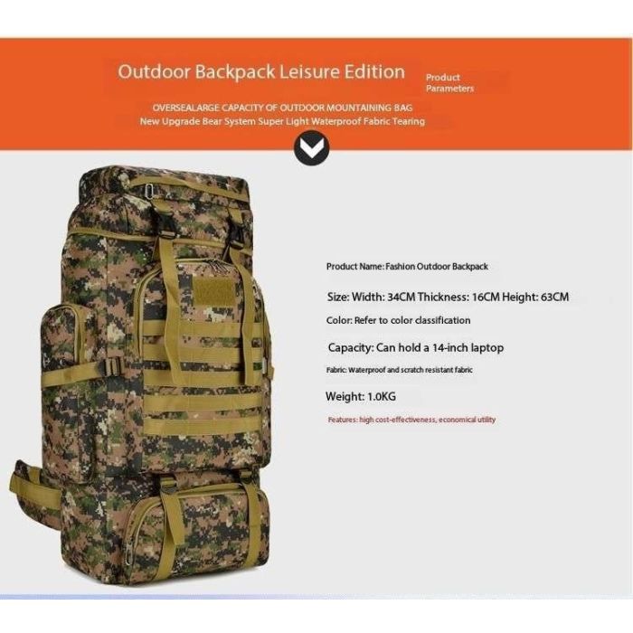 Built for adventure and convenience, this 80L travel backpack offers generous space and durable design for extended trips. Its versatile style suits both men and women, with multiple compartments for organized packing. Whether you're heading out for a weekend getaway or a long-distance journey, this lightweight yet rugged backpack makes carrying gear effortless.Today's Deal is 80L Large Capacity Travel Backpack 63 × 16 × 34 cm