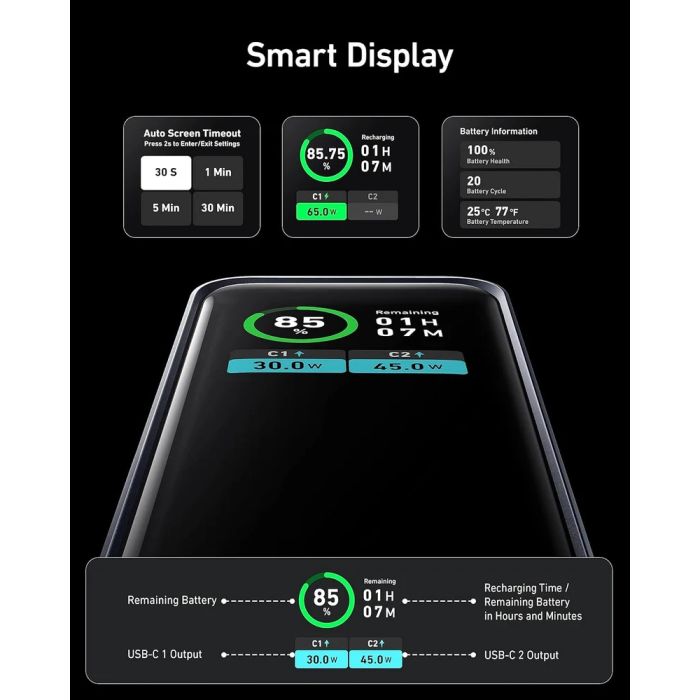 - The 65W rapid recharge enables the power bank to be fully charged in 45 minutes.