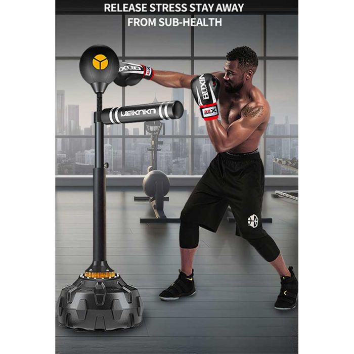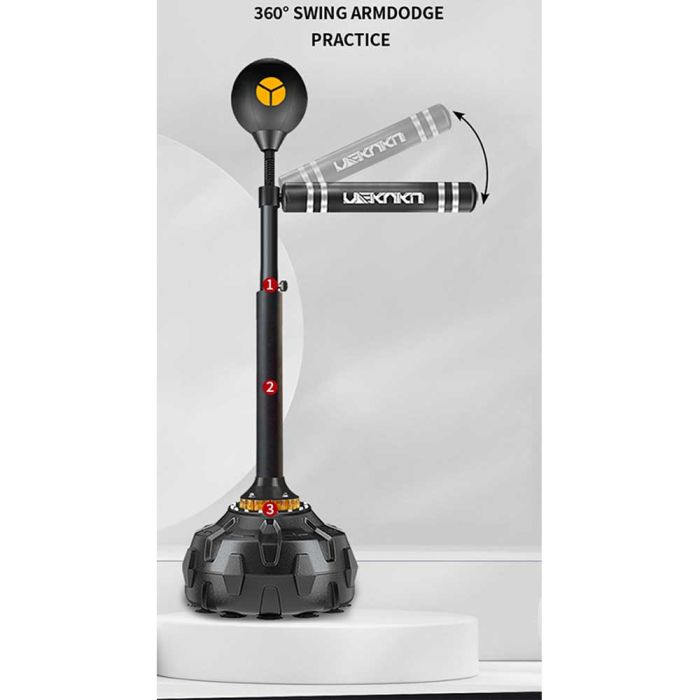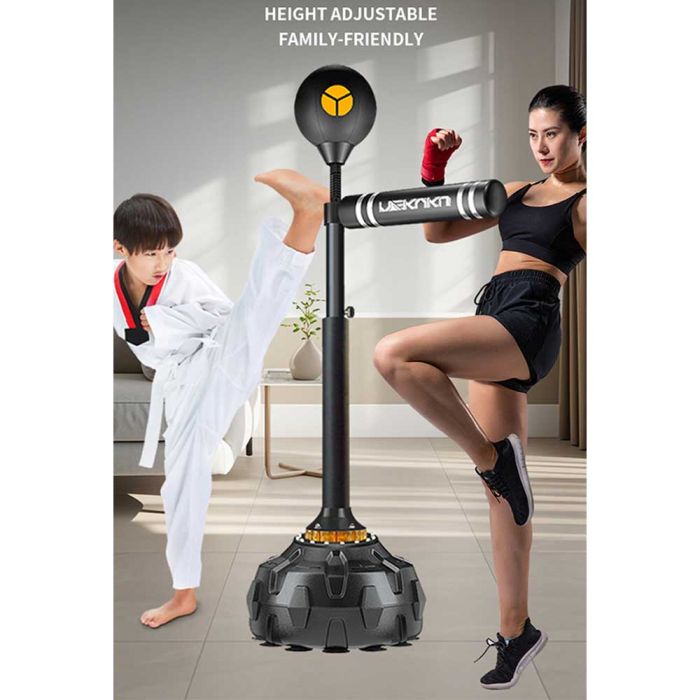 This adjustable boxing training target delivers a professional experience with a 360-degree rotating arm and a fast rebound head that boosts accuracy and speed. Its stable base features twelve strong suction cups, combined with a durable height-adjustable frame, providing effective performance for enhancing reaction, flexibility, and overall boxing skills.
