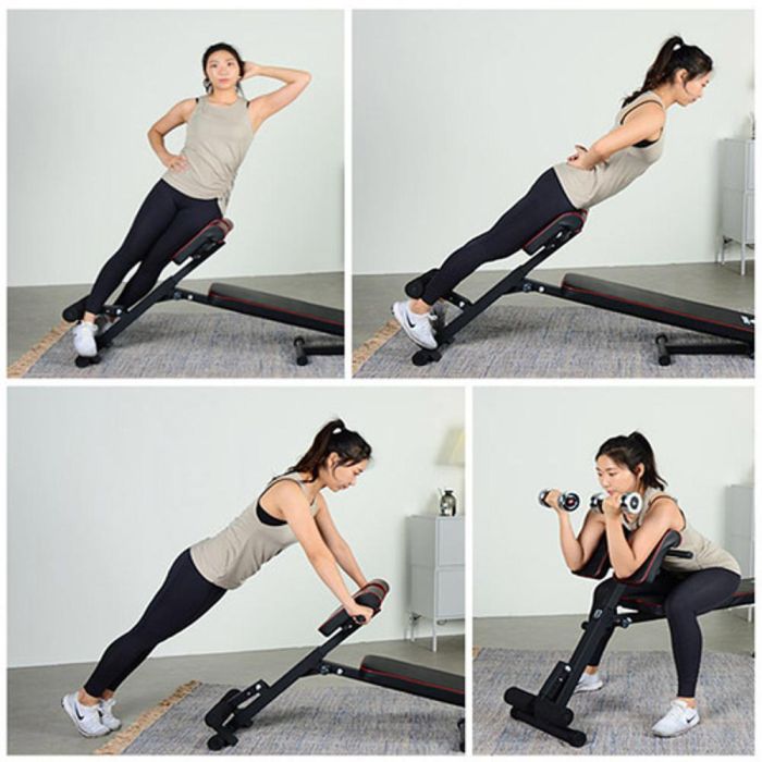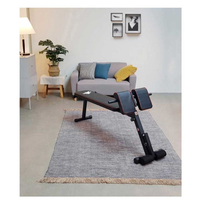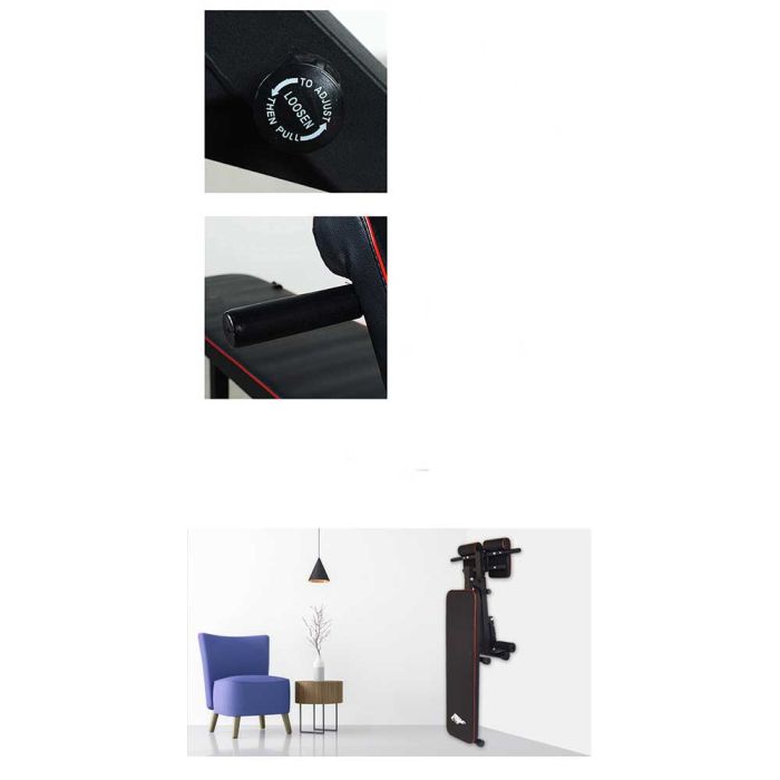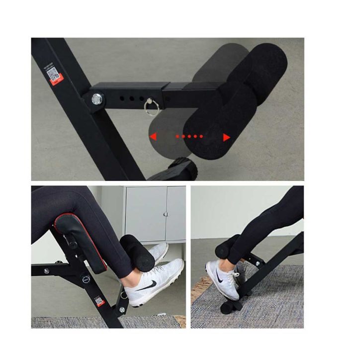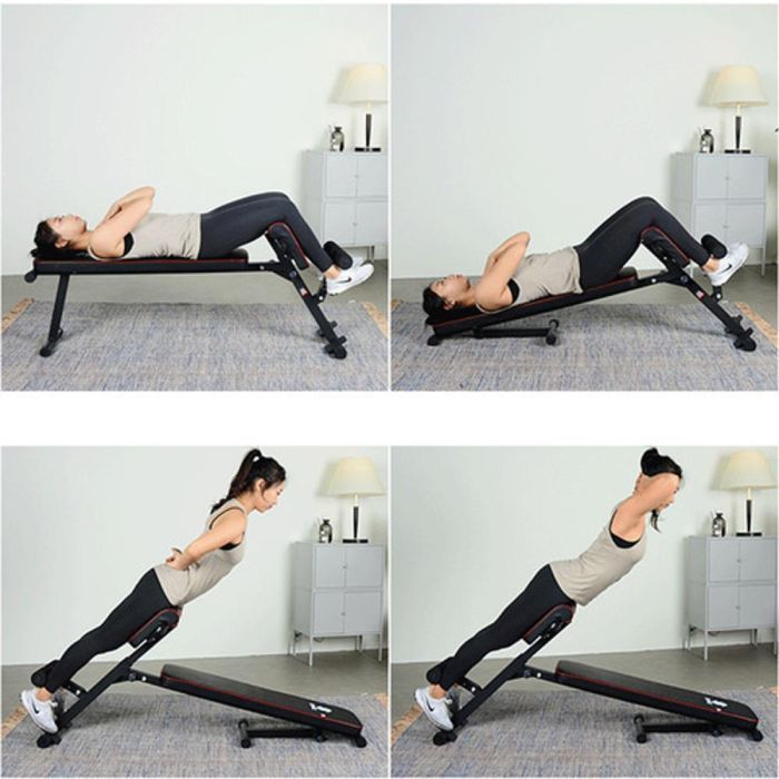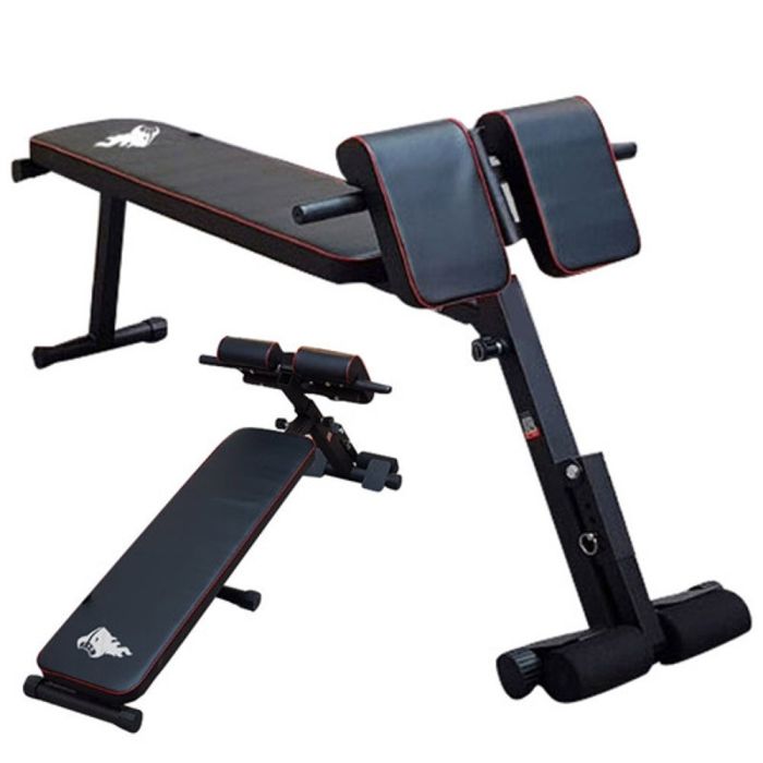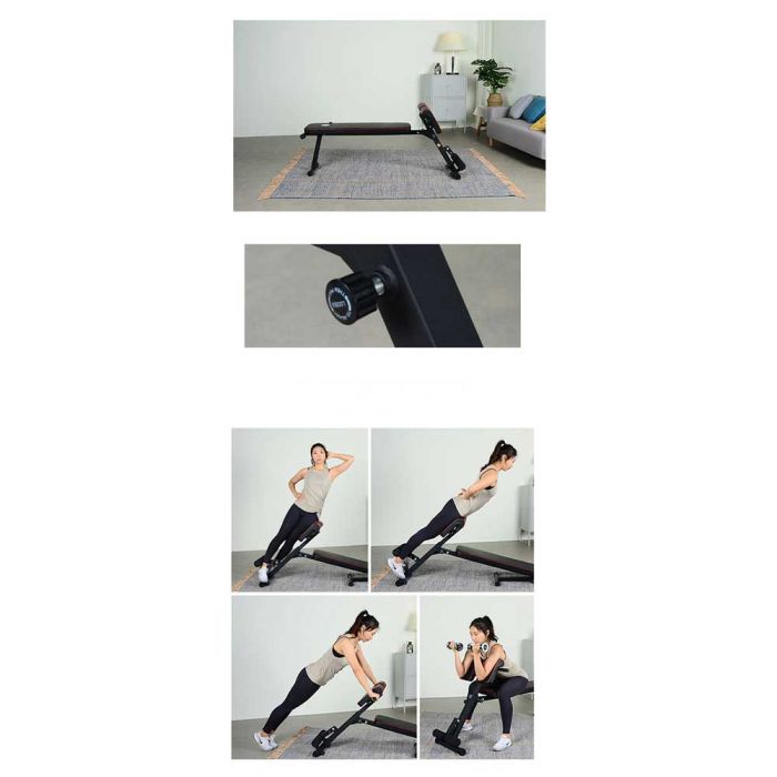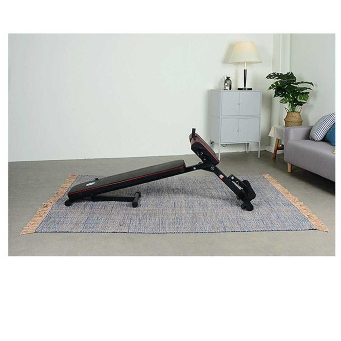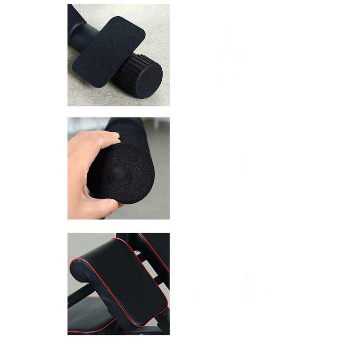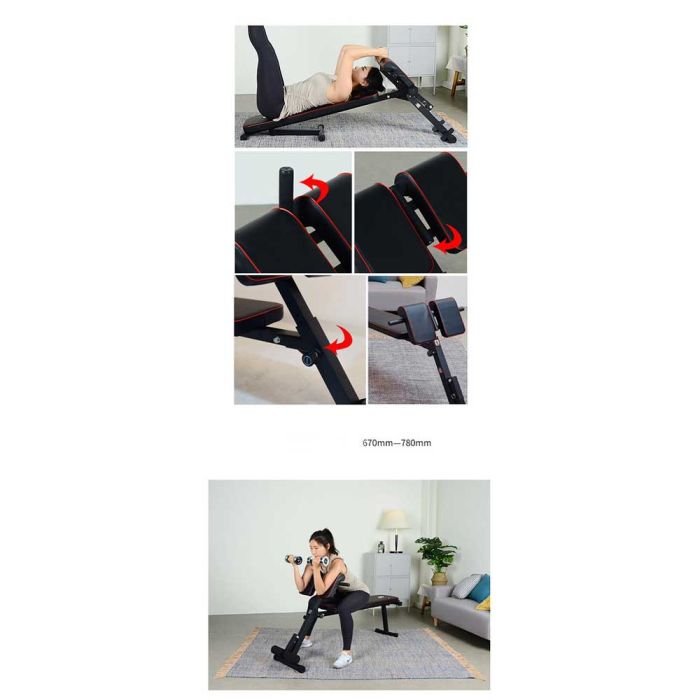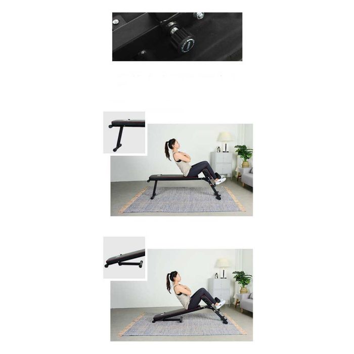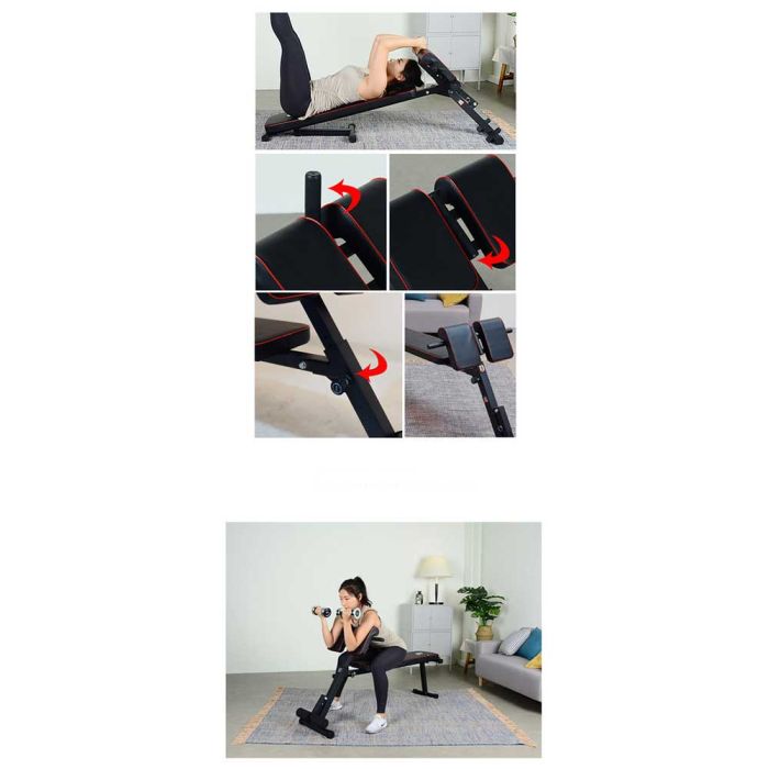 This adjustable folding training bench offers a complete workout for abs, back, and legs. Built with a durable steel frame for intensive use, it features soft PU leather pads and foldable handles. It can be adjusted to six levels for various exercises, provides high stability, easy storage, and requires no assembly.