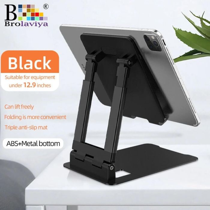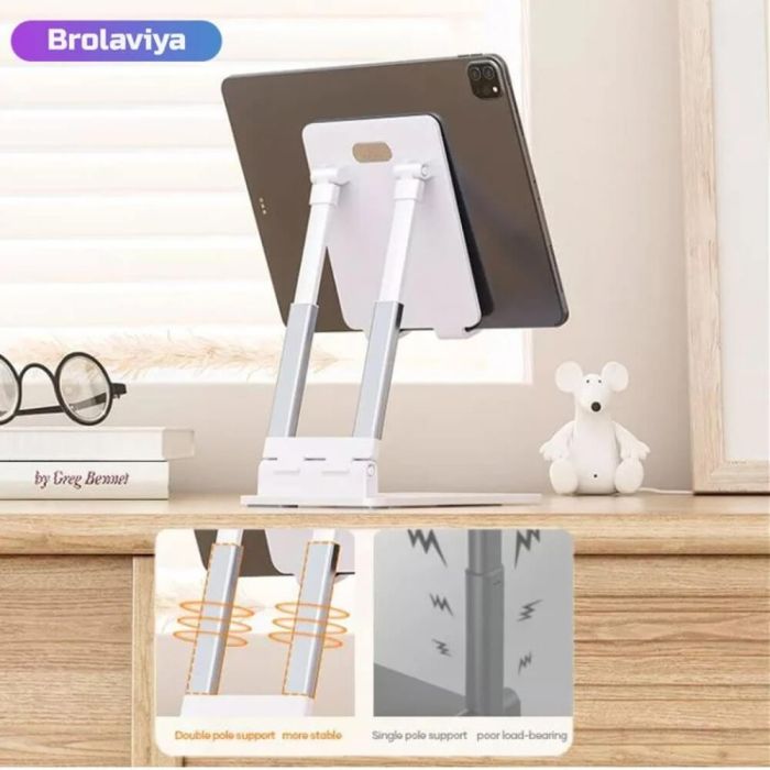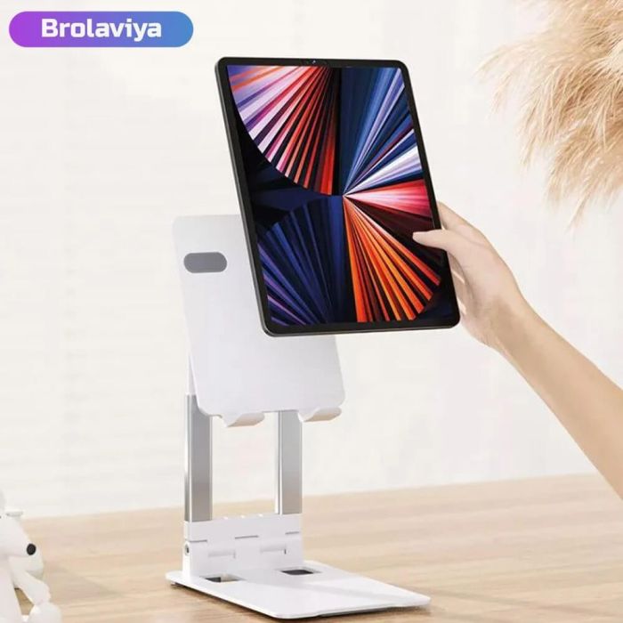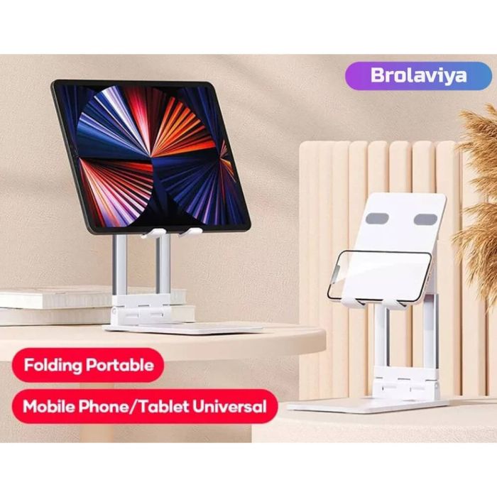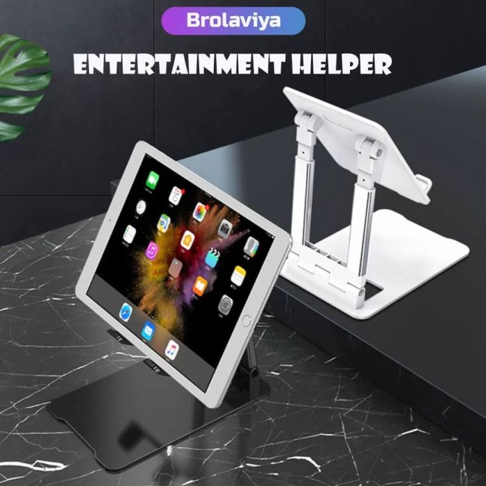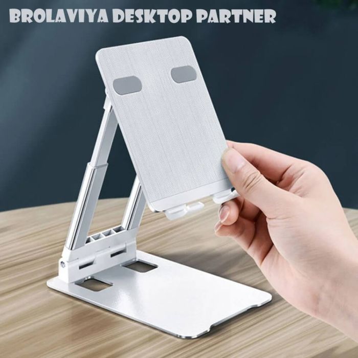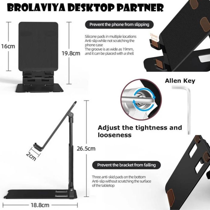 Comfortable viewing experience with the Brolaviya foldable stand, designed for phones and tablets from 4 to 11 inches. Crafted from sleek, lightweight aluminum, this stand offers adjustable height from 19 to 26 cm and supports both vertical and horizontal views. It promotes better posture and reduces eye and neck strain. Ideal for work, study, or watching videos, and easily portable for use anywhere. No tools required—just smart, stylish, and functional design all in one.