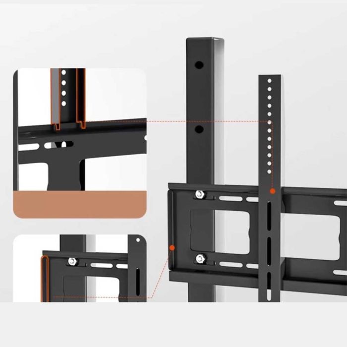 Upgrade and organize your display space with an adjustable TV base with wheels and a top plate made from a strong metal frame, offering high stability and smooth mobility, with a supportive design suitable for large screens and enhanced space organization